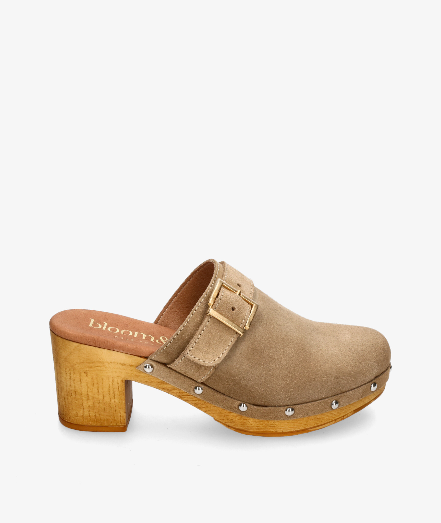 bloom&you Wooden sandals KATY in taupe split suede.Look stylish this season with this taupe split suede Shoes from our pabloochoa.shoes collection. Our glove shoes feature a combination of design, quality and comfort for your day to day outfits. They are composed of a very soft and comfortable construction, adapting to the feet as a glove and maintaining the brand fashion design.