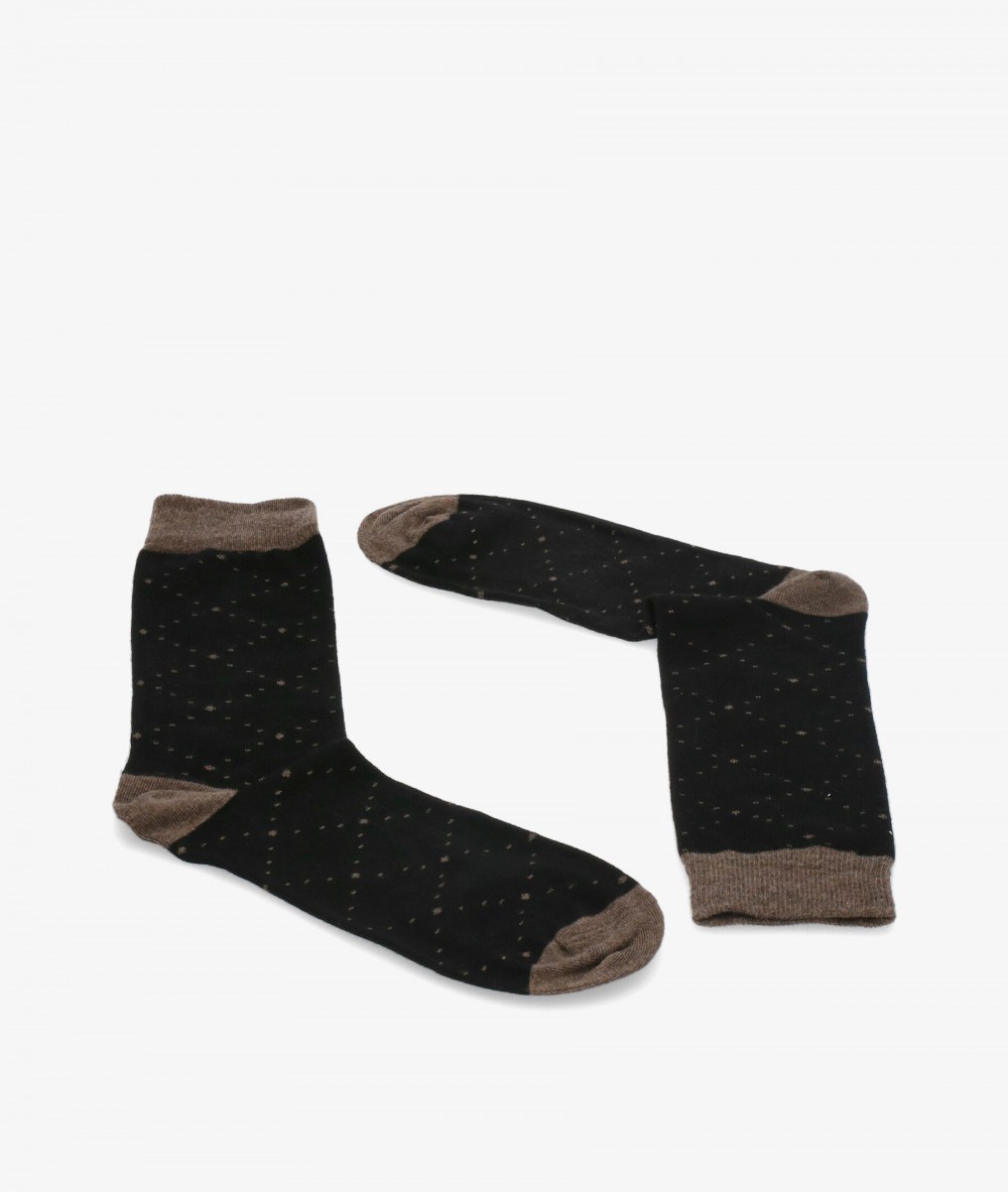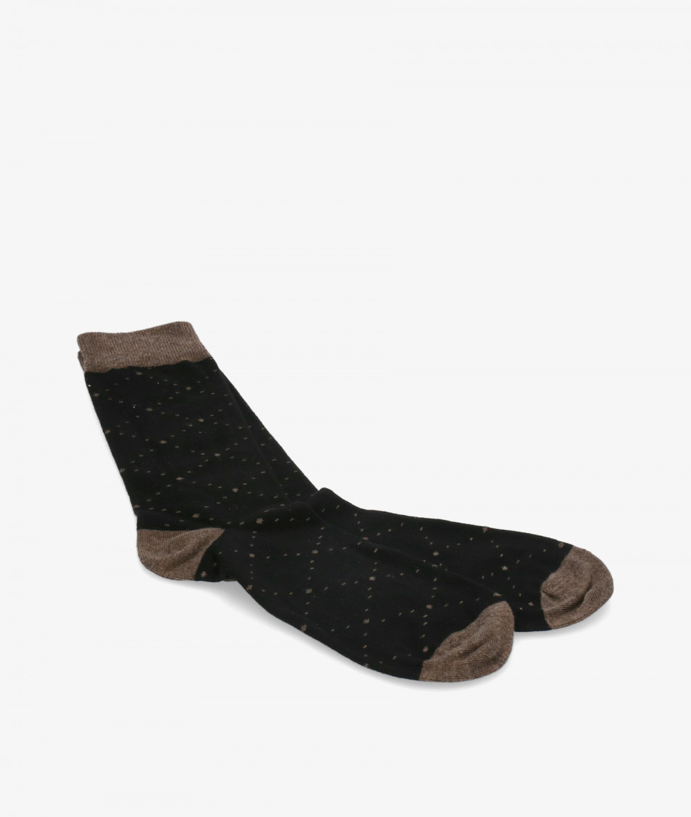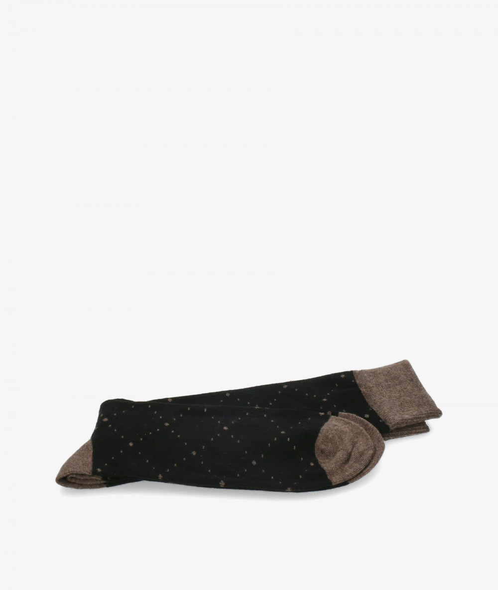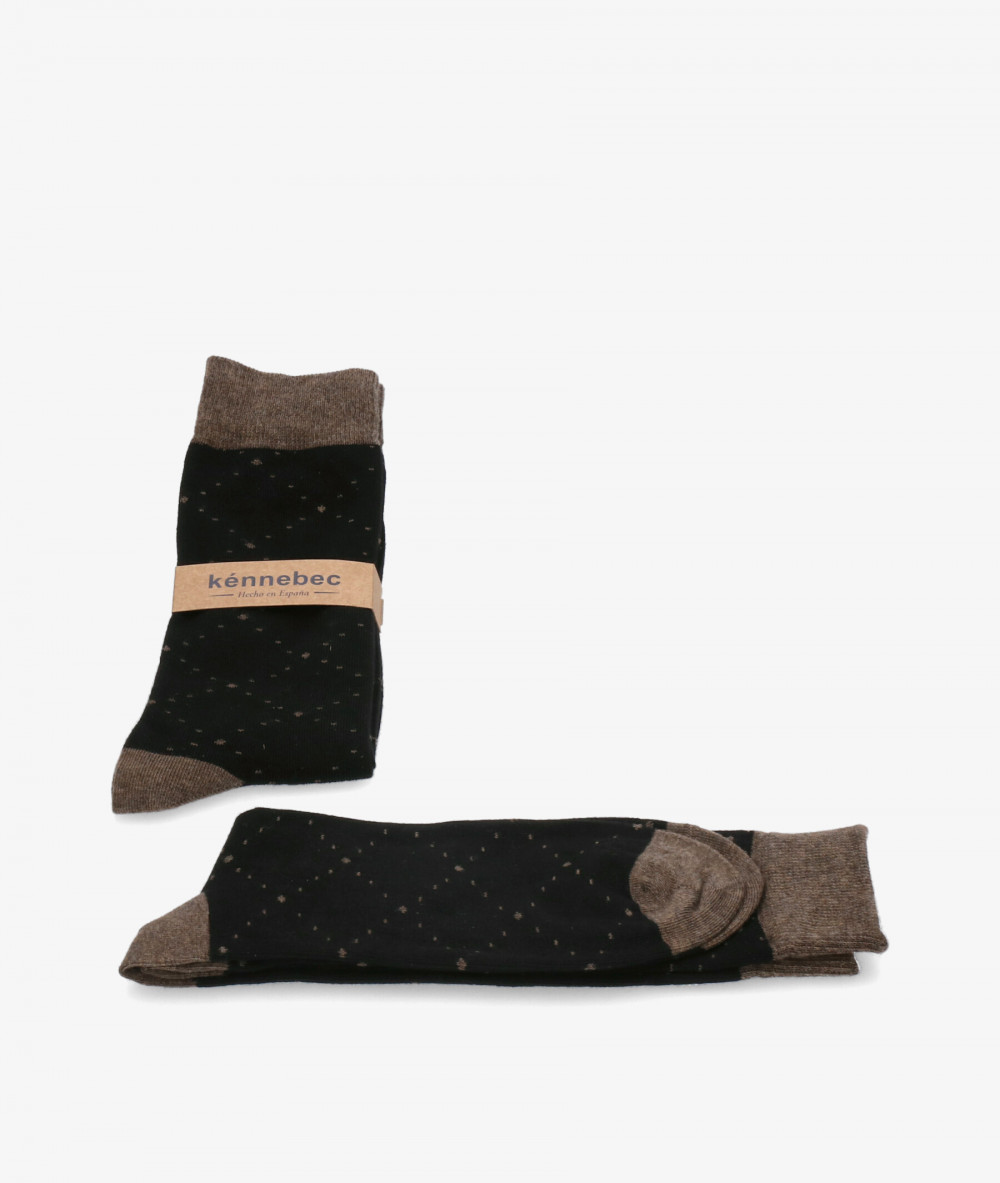 Calcetines Kénnebec en negro. Calcetines negros, con diseño de puntos, talonera y puntera en color taupe. Nuestros calcetines Kénnebec de hombre están fabricados en algodón orgánico y son diseños exclusivos de Kénnebec. El algodón orgánico está certificado por GOTS (Global Organic Textile Standard). Composición: 82% algodón orgánico, 15% poliamida y 3% elastano. Hecho en España.. Hecho en España.. Talla única (38-45)