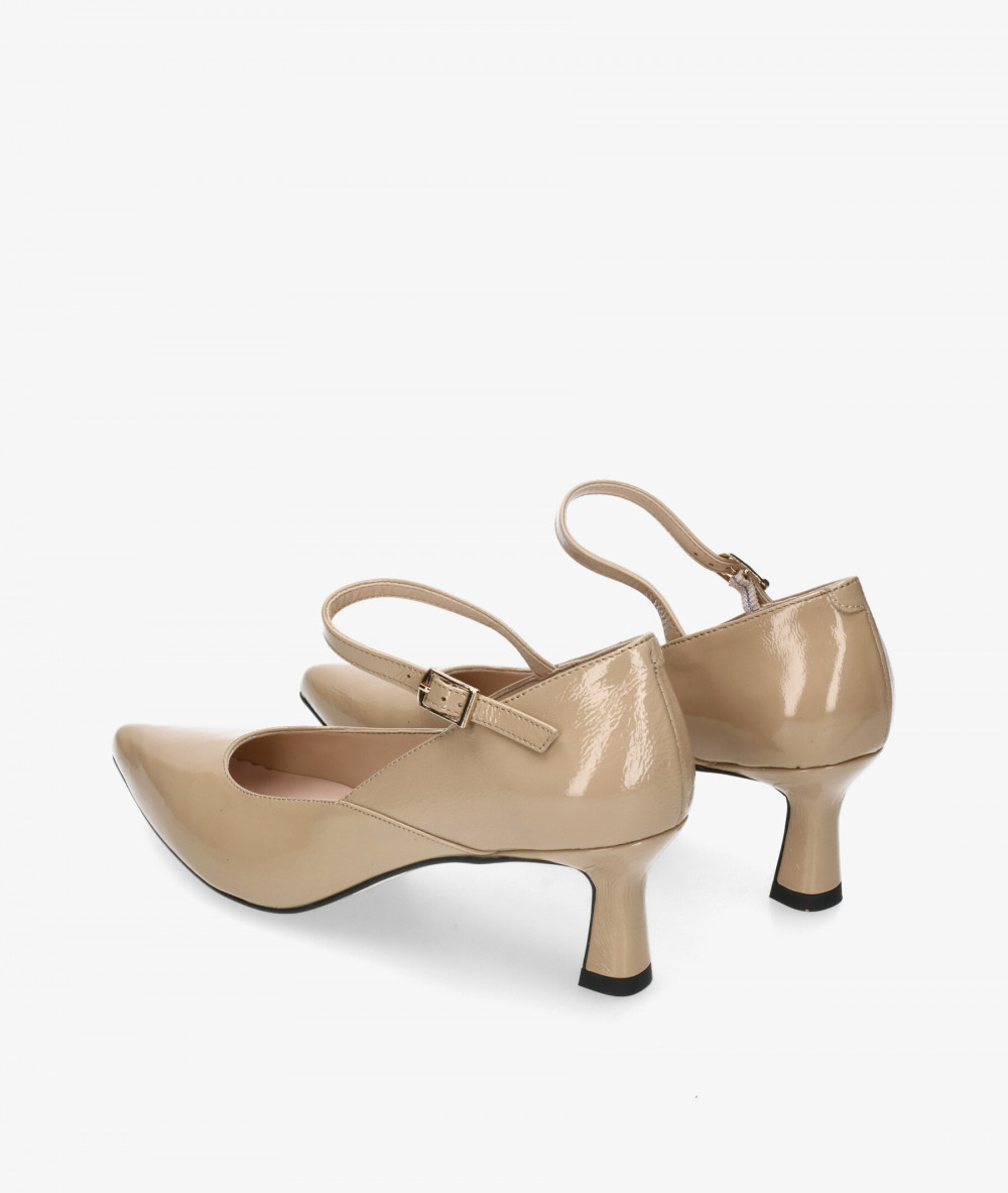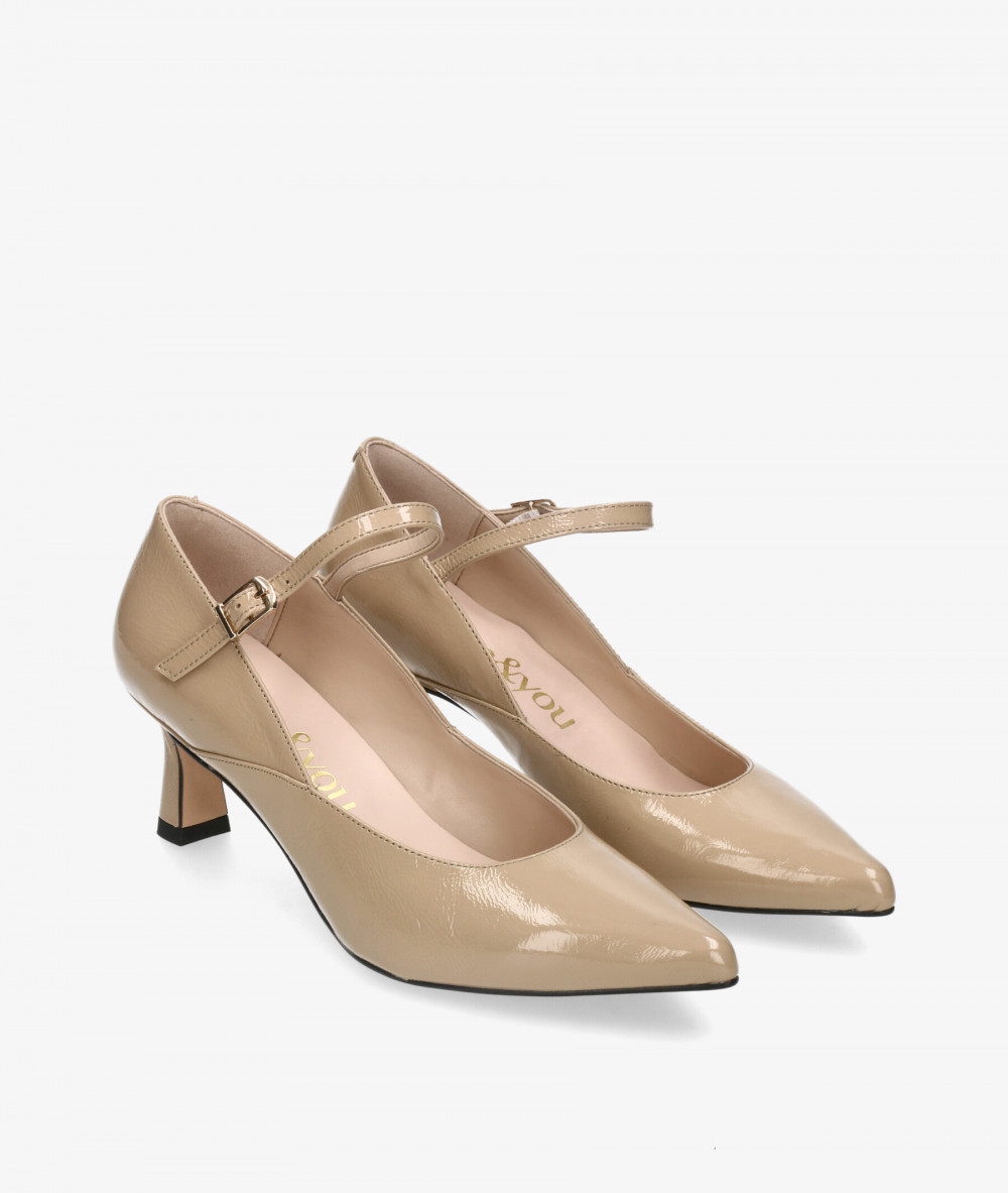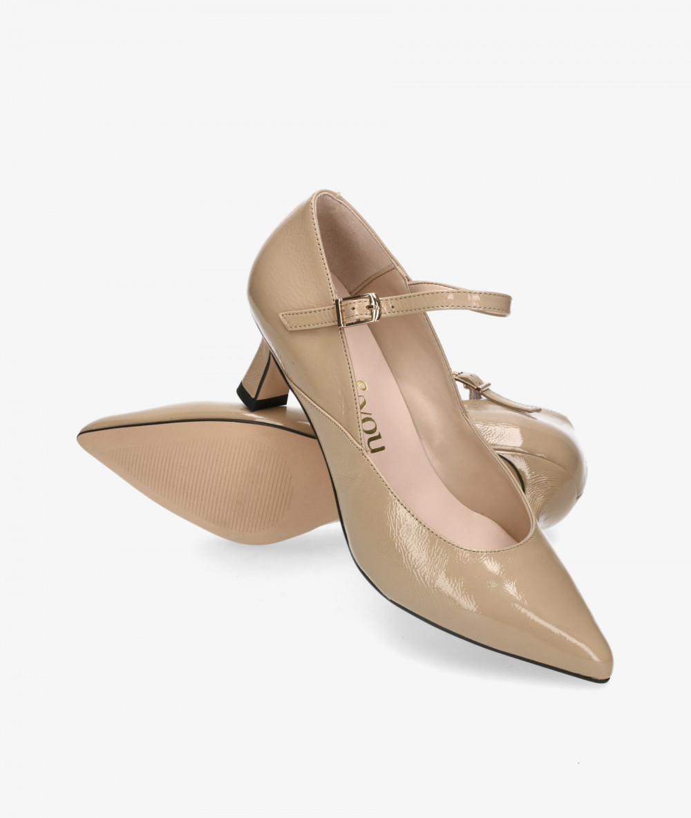 Zapatos de vestir bloom&you CARRIE en charol taupe. Altura tacón 5,5cm. Cierre con hebilla en un lateral. La plantilla no es extraible. Hecho en España.