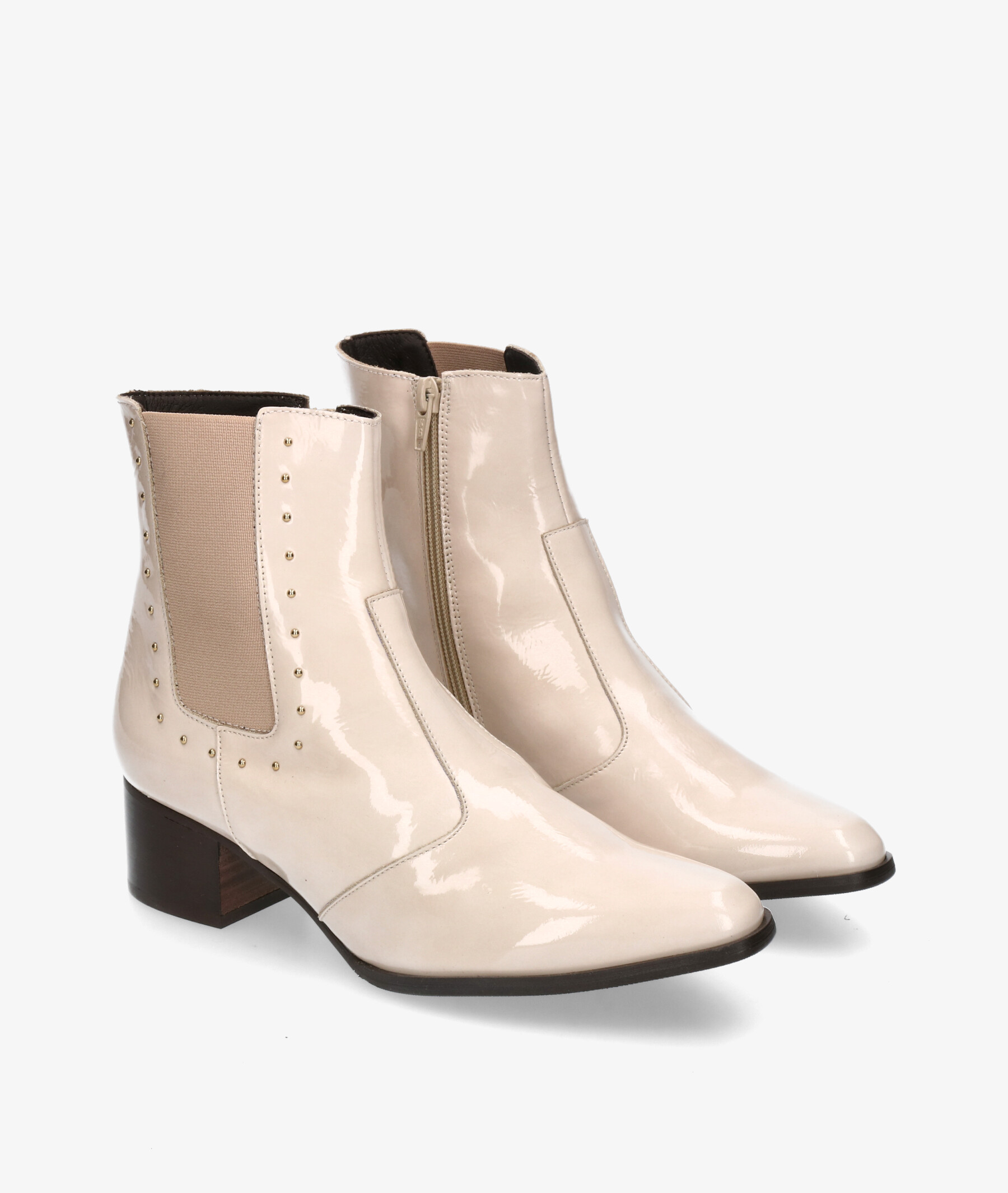 Botines bloom&you STELLA en charol beige. Altura tacón 4cm. Cierre con cremallera en la parte interior. La plantilla no es extraible. Hecho en España.