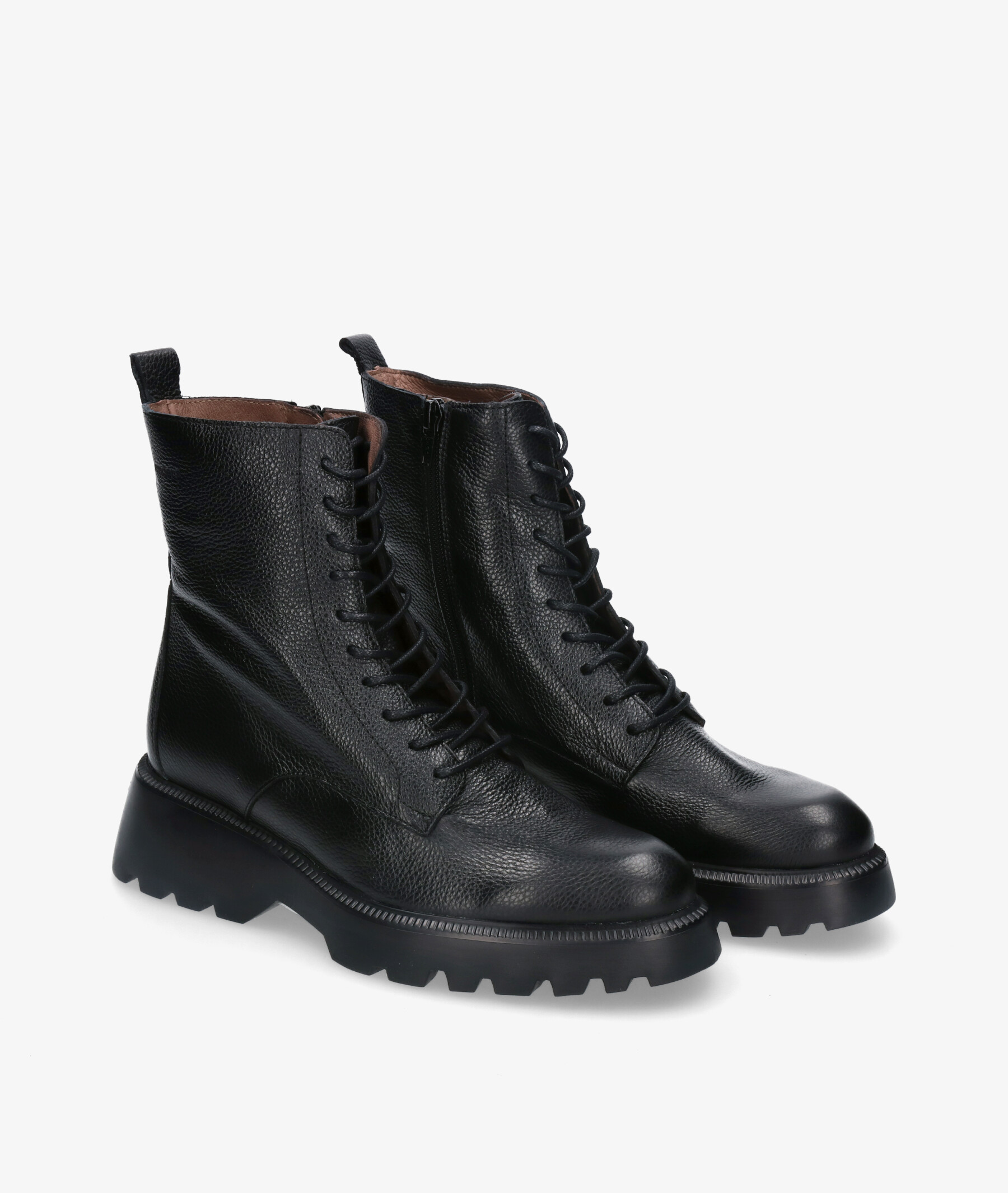 Botines Wonders Atari en negro. Tacón 4,5cm, plataforma 2cm. Cierre con cremallera y cordones. La plantilla no es extraible. Hecho en España.