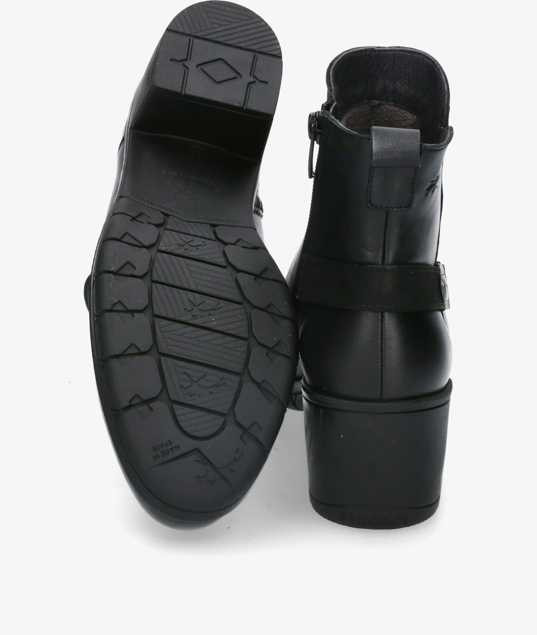 Botines Fluchos F1798 en negro. Altura tacón 5cm. Cierre con cremallera en la parte interior. La plantilla es extraible. Hecho en España.