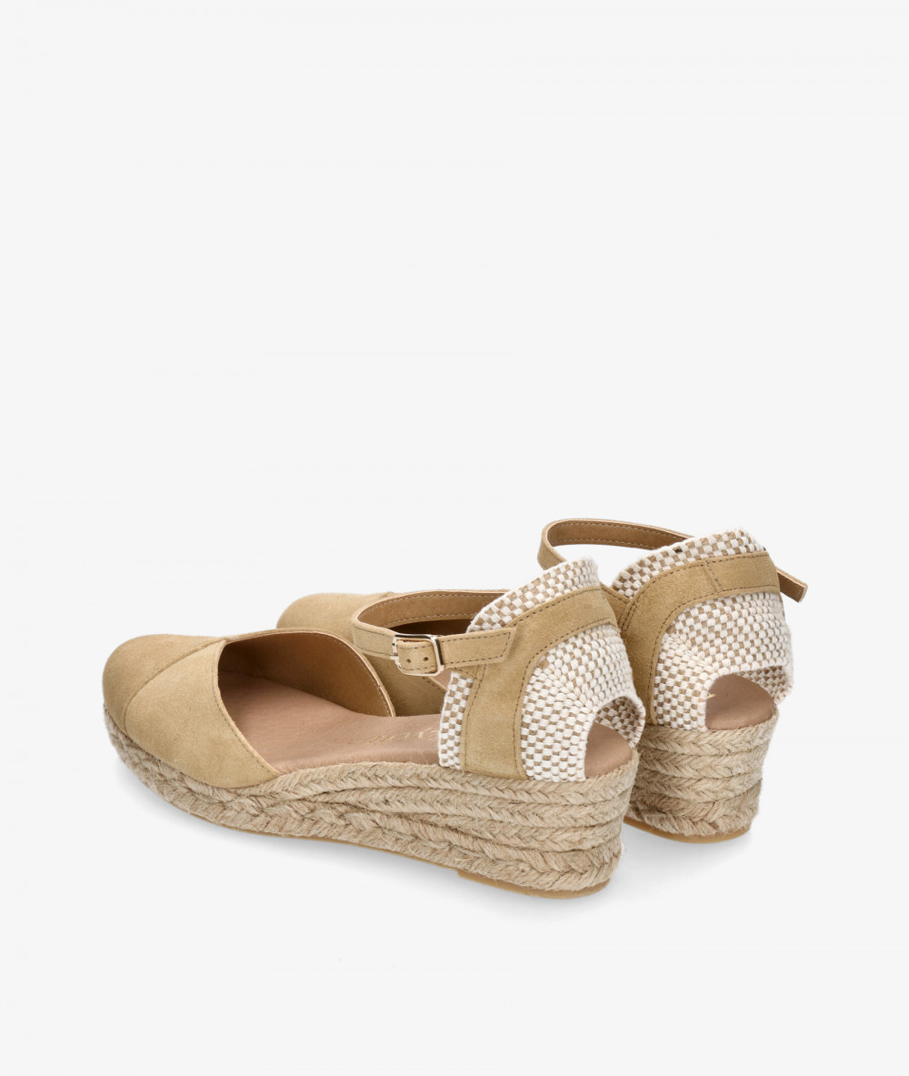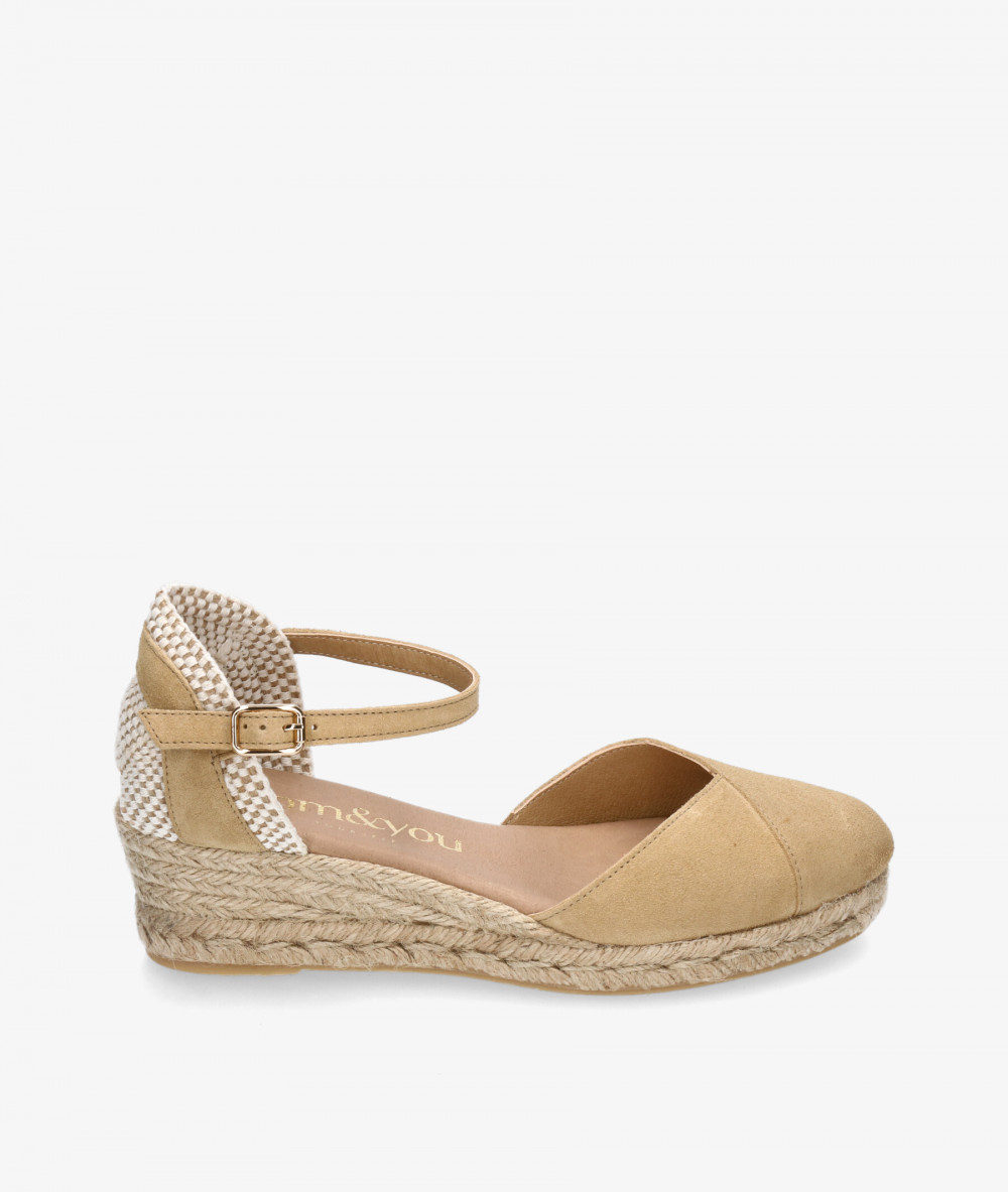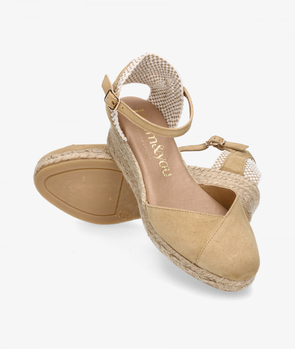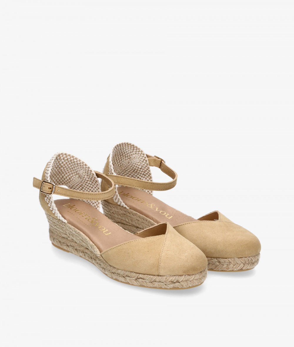 Alpargatas bloom&you DALIA en serraje beige. Cuña 4,5cm, plataforma 1,5cm. Cierre con hebilla en un lateral. La plantilla no es extraible. Hecho en España.