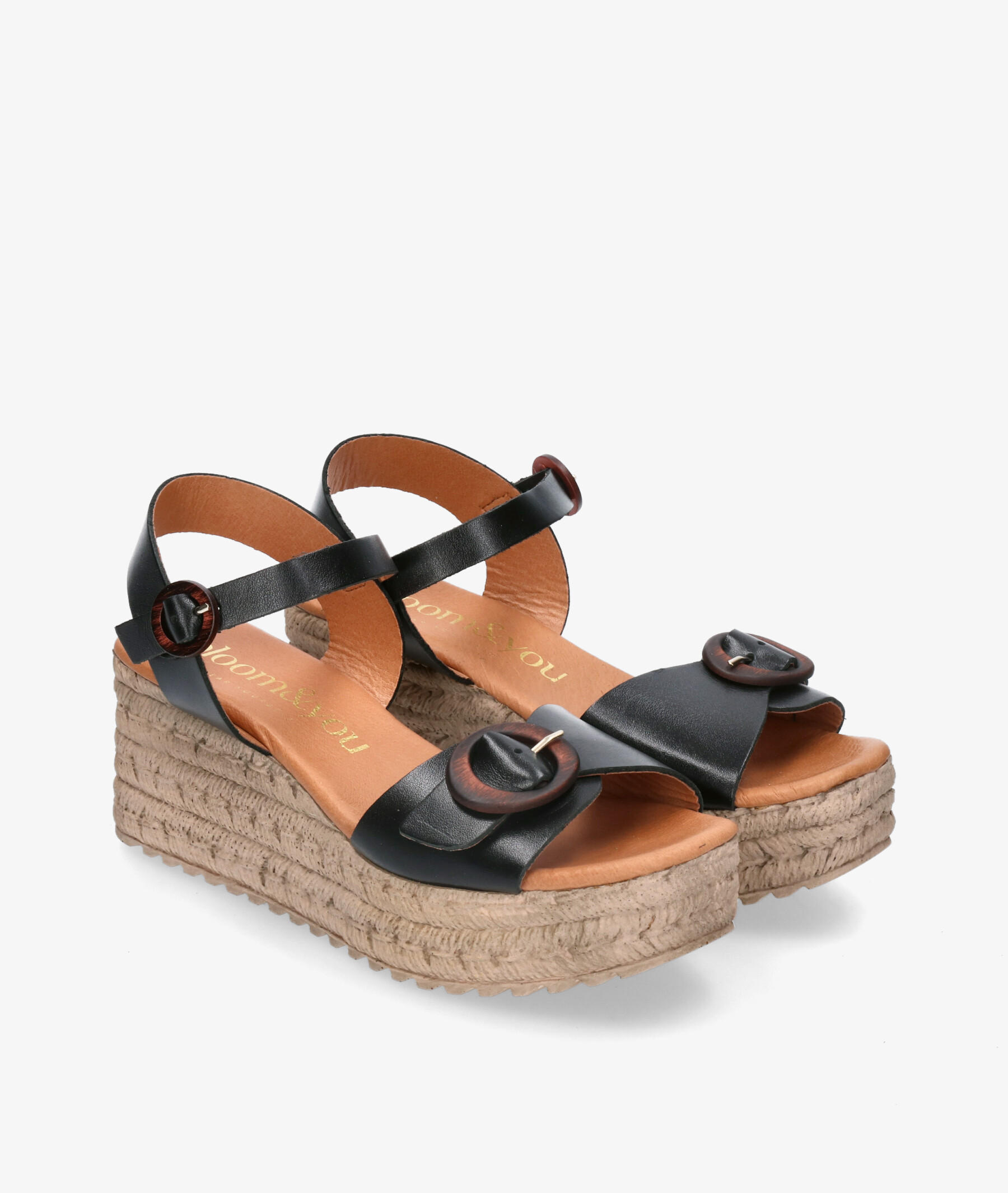 Sandalias bloom&you URBAN en negro. Cuña 6,5cm, plataforma 3,5cm. Cierre con hebilla en un lateral. La plantilla no es extraible. Hecho en España.