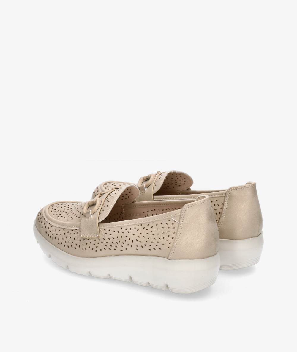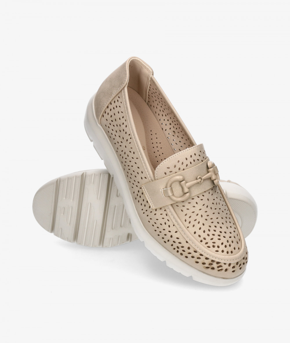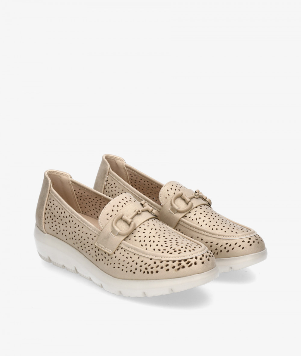 Zapatos confort Amarpies 28581 en platino. Cuña 4cm. Sin cierre, slip on. La plantilla es extraible. Hecho en China