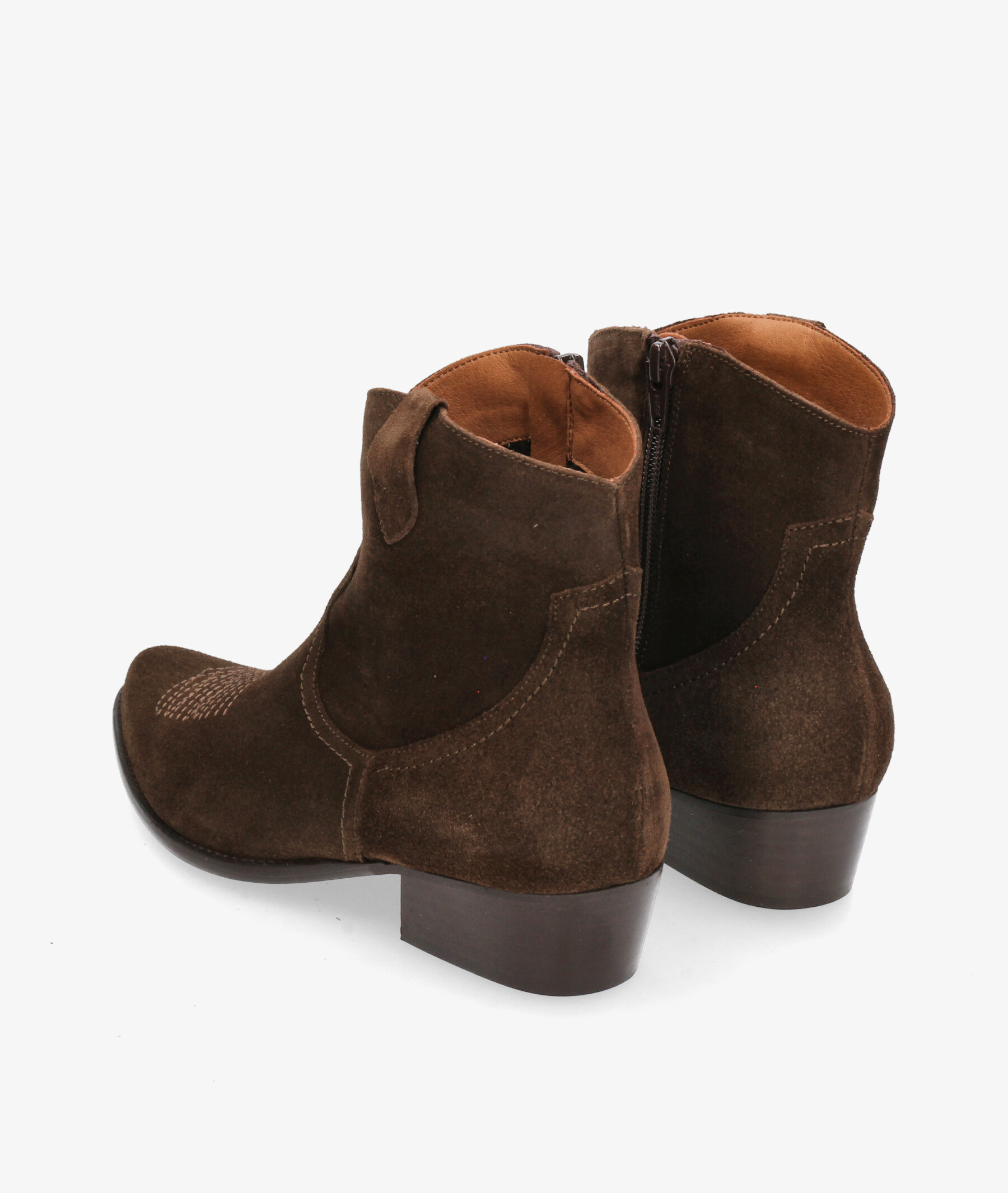 Botines Bryan CALIOPE-CB en serraje marrón. Altura tacón 3cm. Cierre con cremallera en la parte interior. La plantilla no es extraible. Hecho en España.