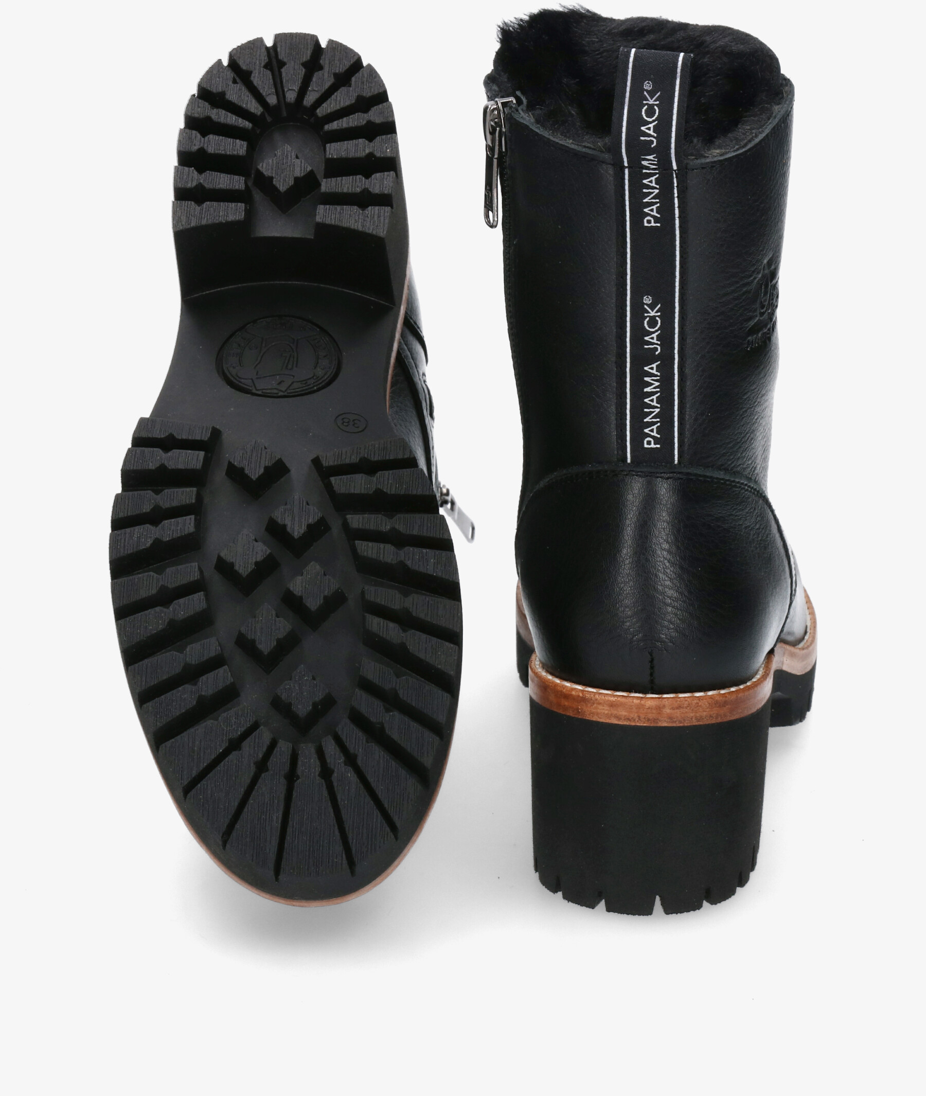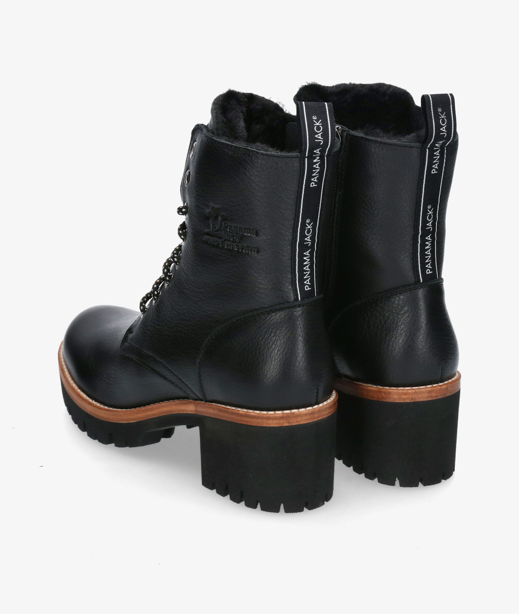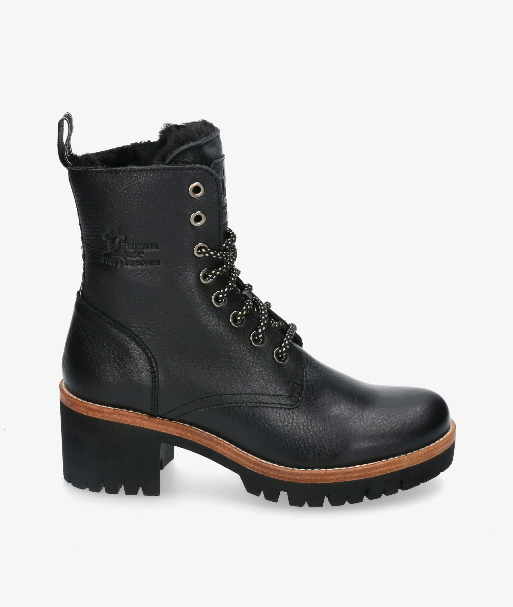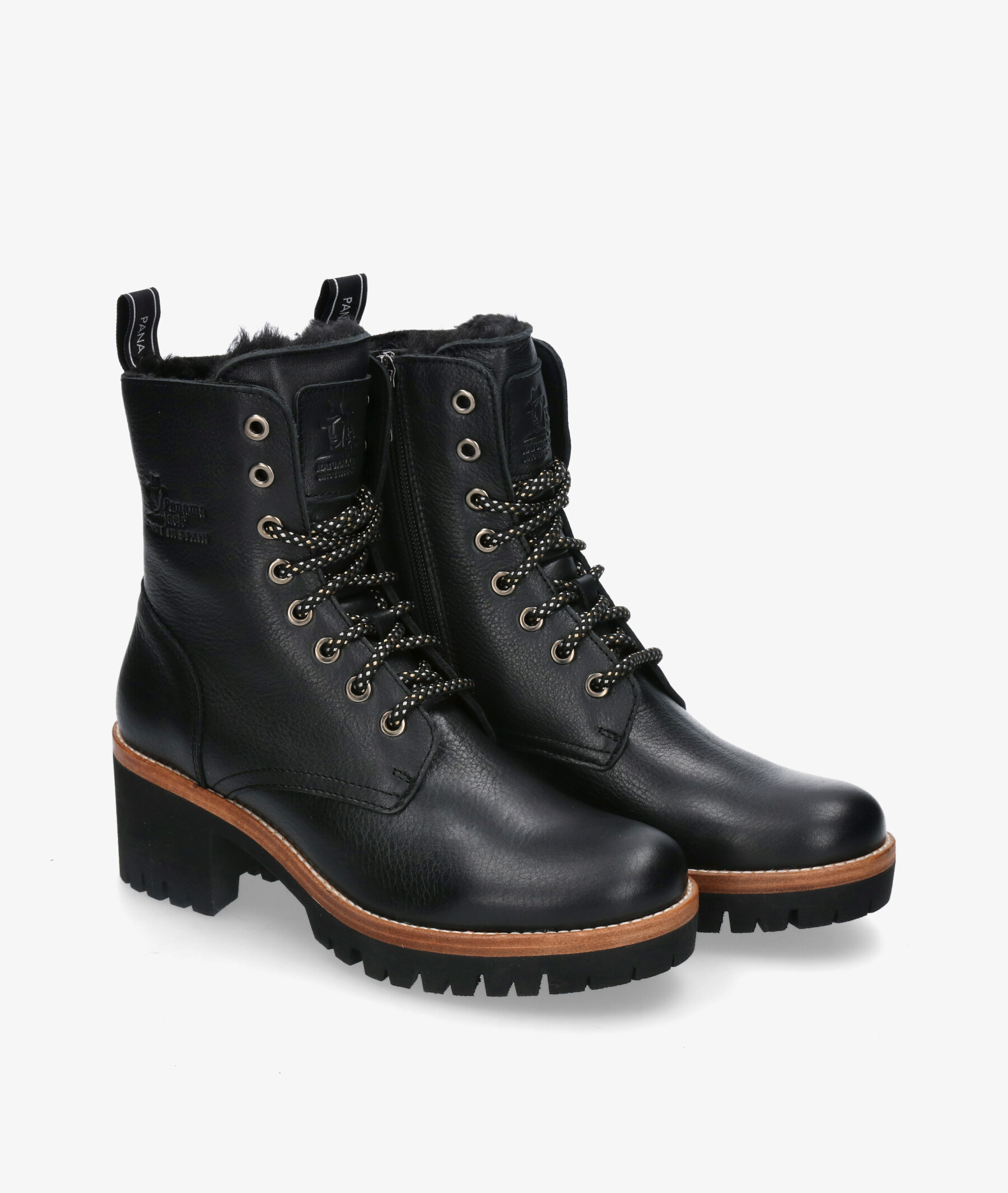 Botines Panamá Jack PADMA B11 en negro. Altura tacón 5cm. Cierre con cremallera y cordones. La plantilla no es extraible. Hecho en España.