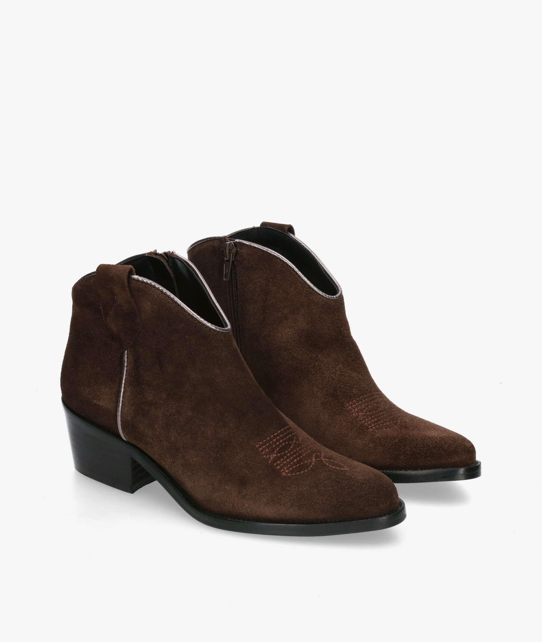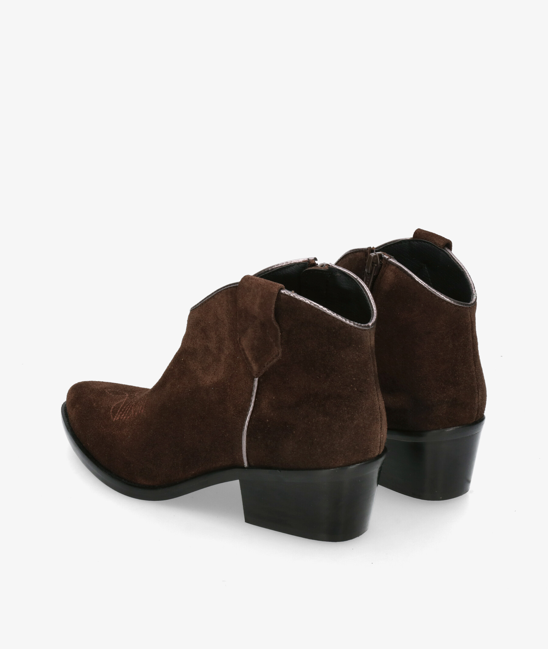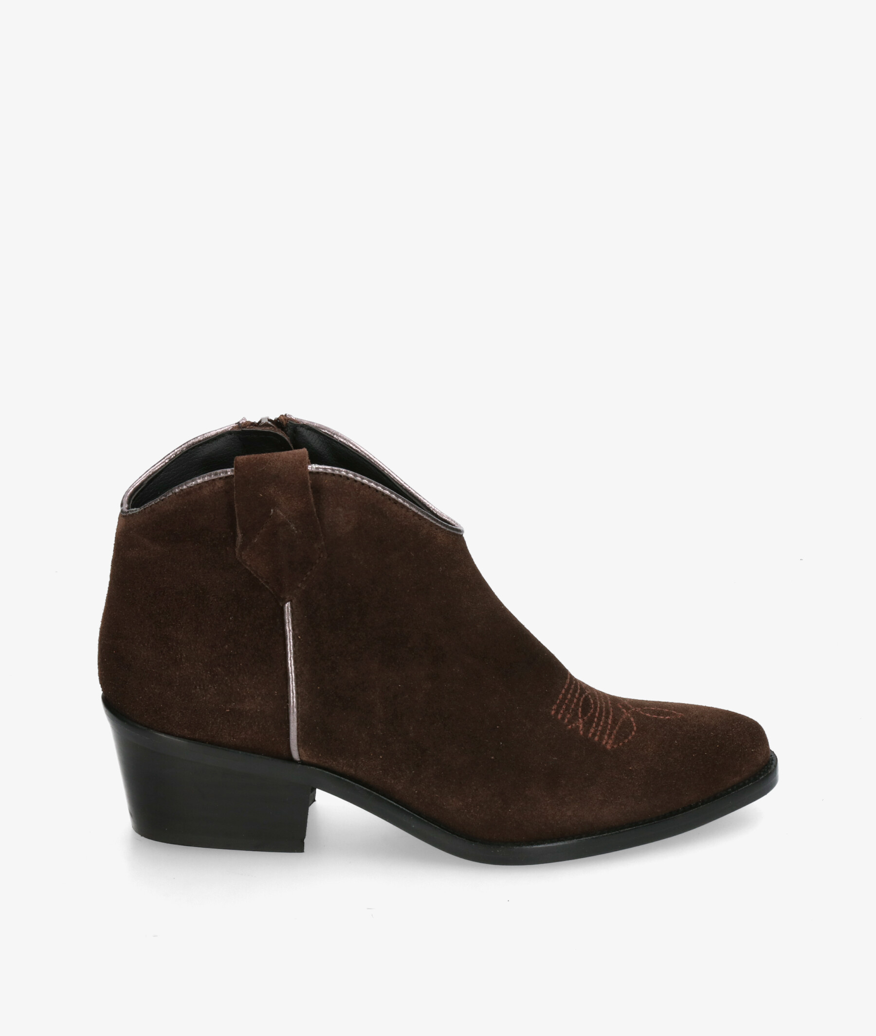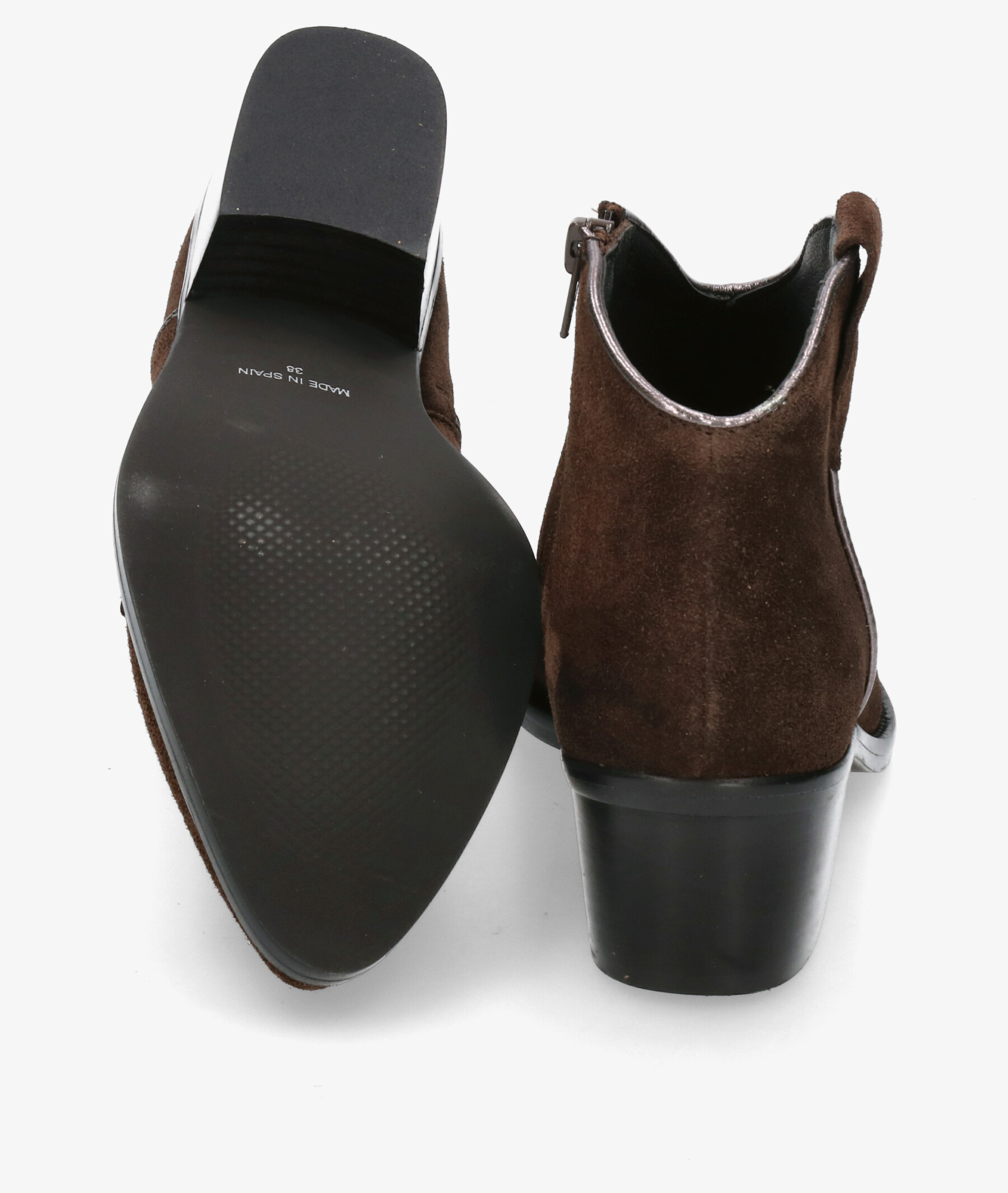 Botines bloom&you TEVA en serraje marrón. Altura tacón 4cm. Cierre con cremallera en la parte interior. La plantilla no es extraible. Hecho en España.