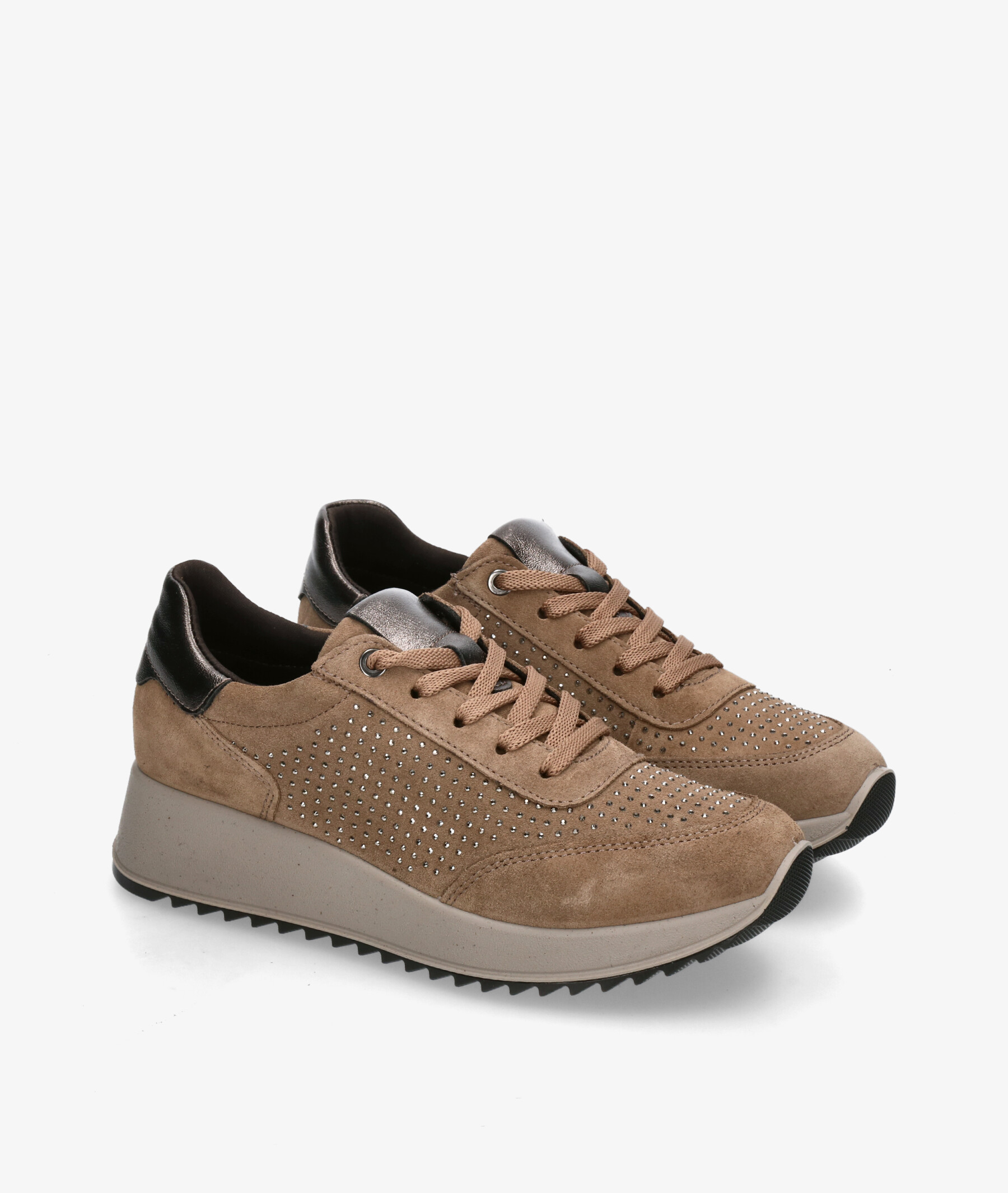 Deportivos Imac 858220 en serraje taupe. Cuña 4cm, plataforma 2cm Cierre con cordones. La plantilla es extraible. Hecho en Italia.