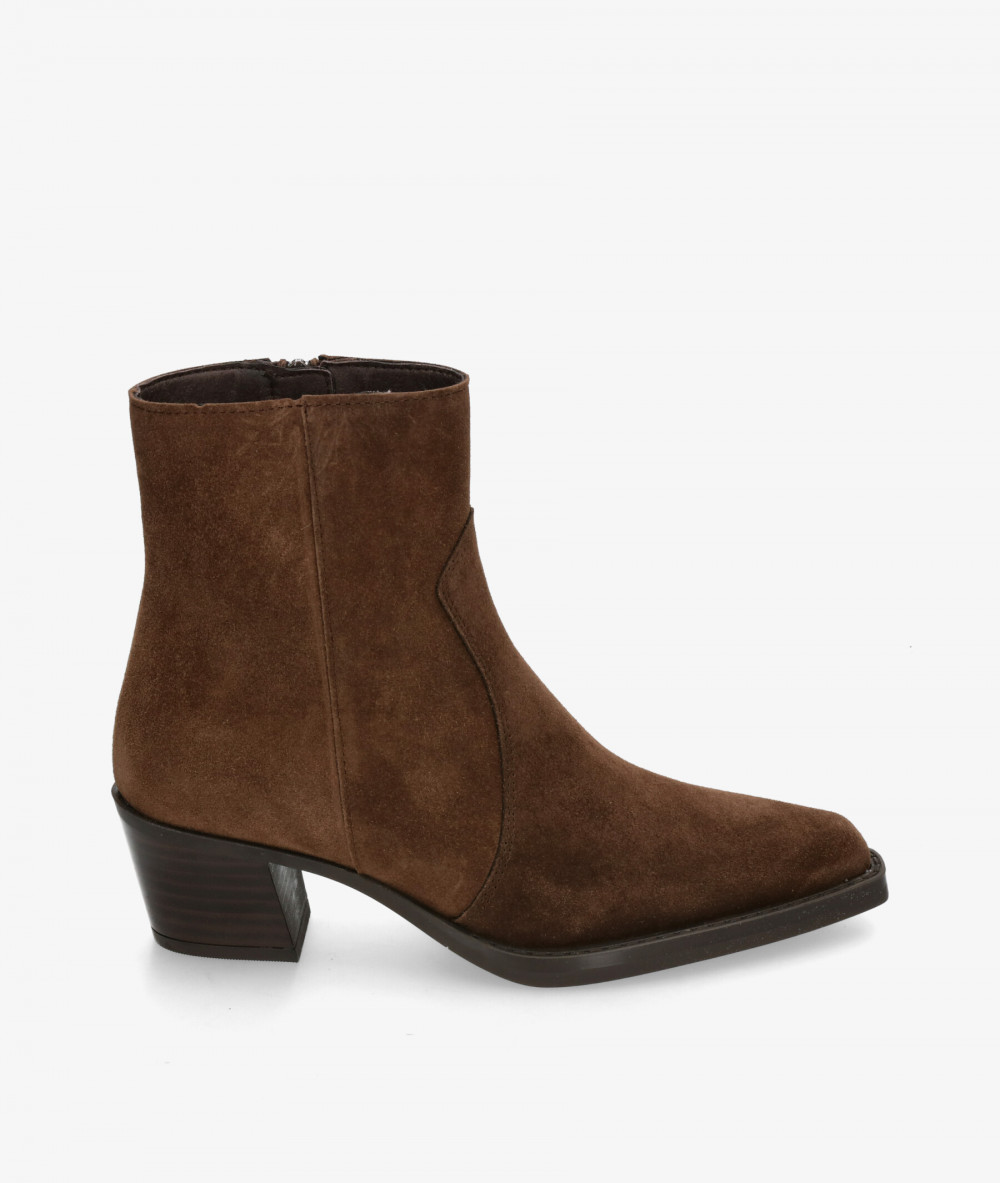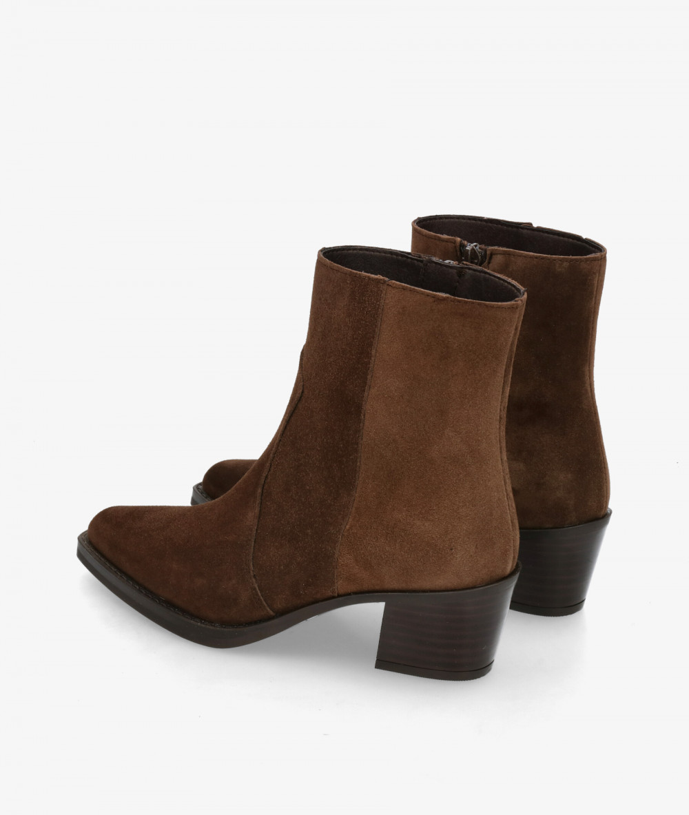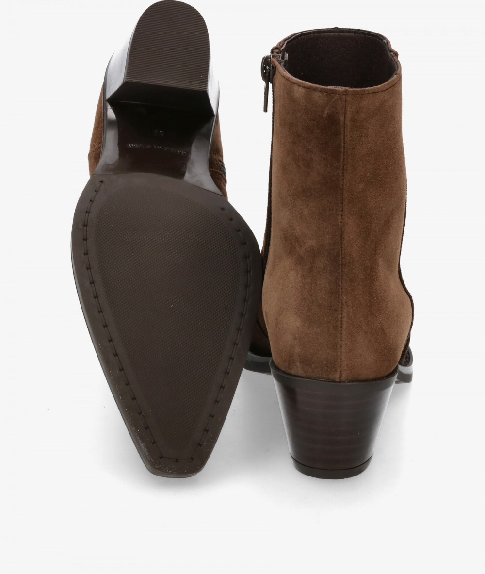 Botines Alpe 5538 en serraje marrón. Altura tacón 5cm. Cierre con cremallera en la parte interior. La plantilla no es extraible. Hecho en España.