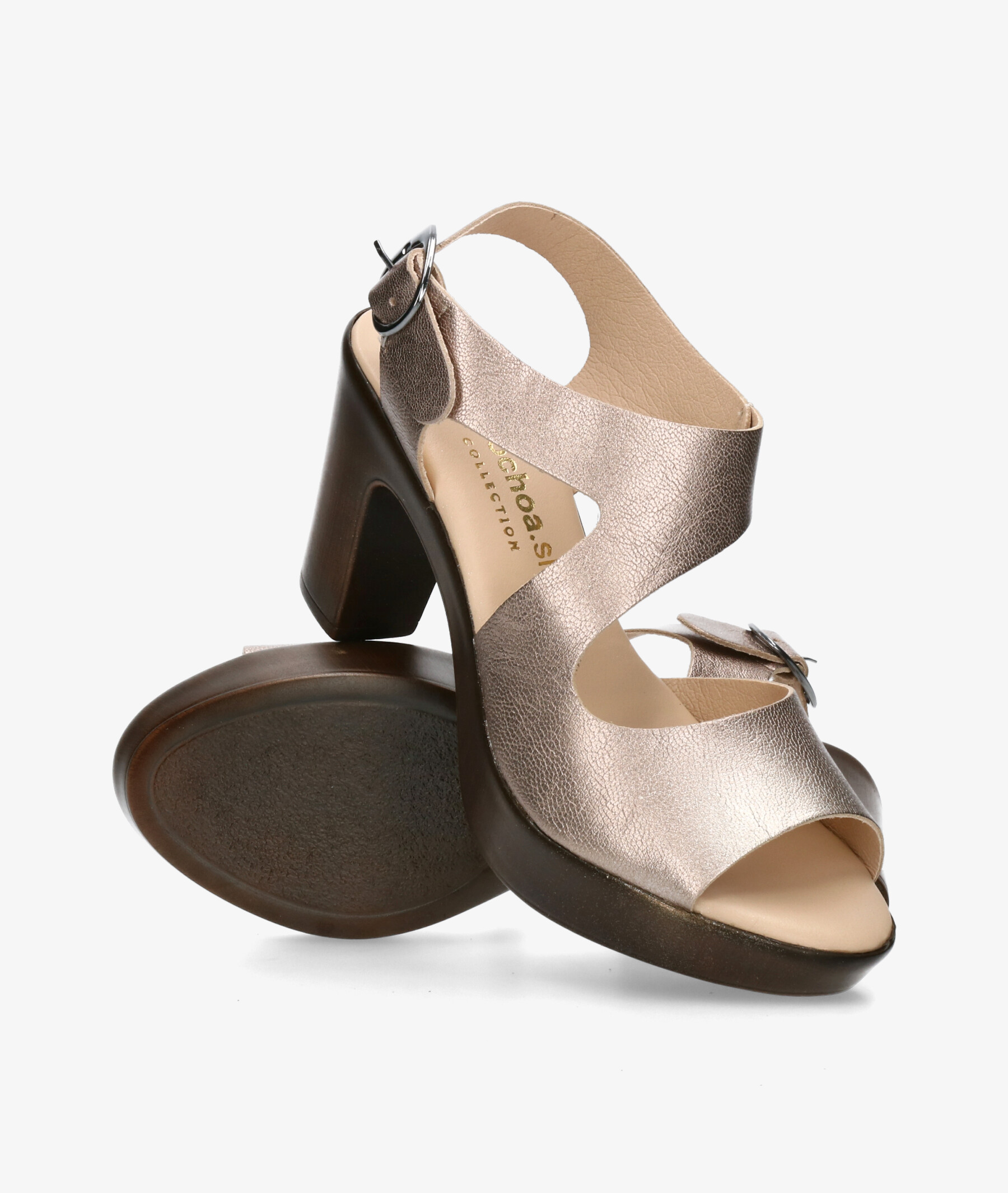 Sandalias pabloochoa.shoes 450 en taupe metalizado. Tacón 8cm, plataforma 2cm. Cierre con hebilla en un lateral. La plantilla no es extraible. Hecho en España.
