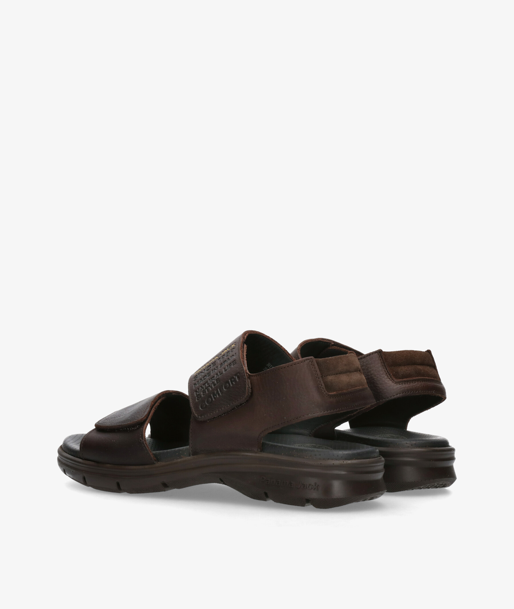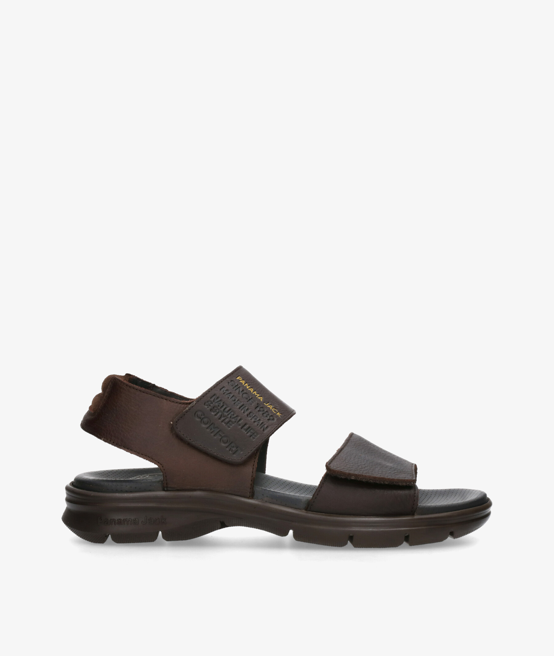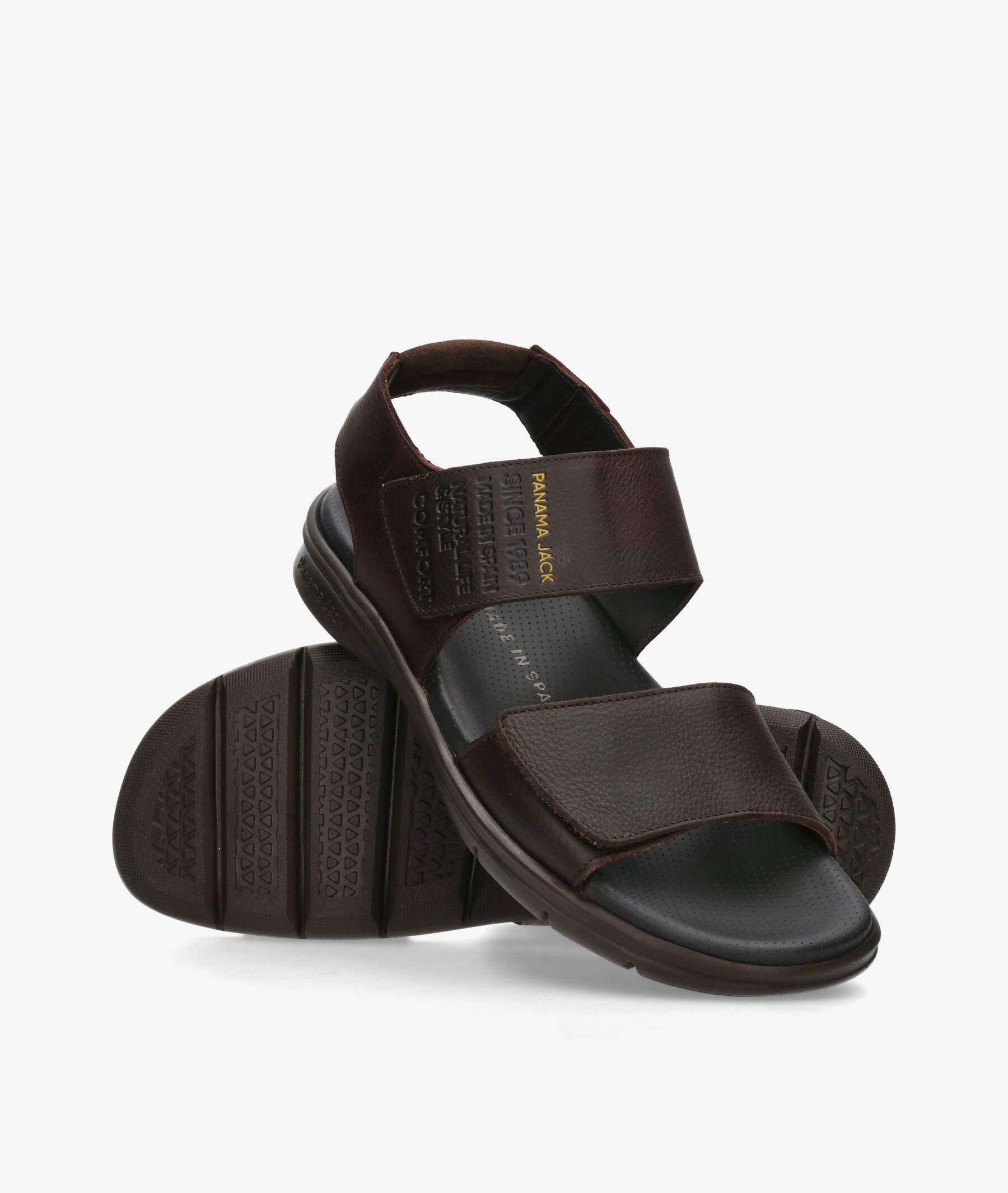 Sandalias Panamá Jack RUSELL en marrón. Cierre con velcro. La plantilla no es extraible. Hecho en España.