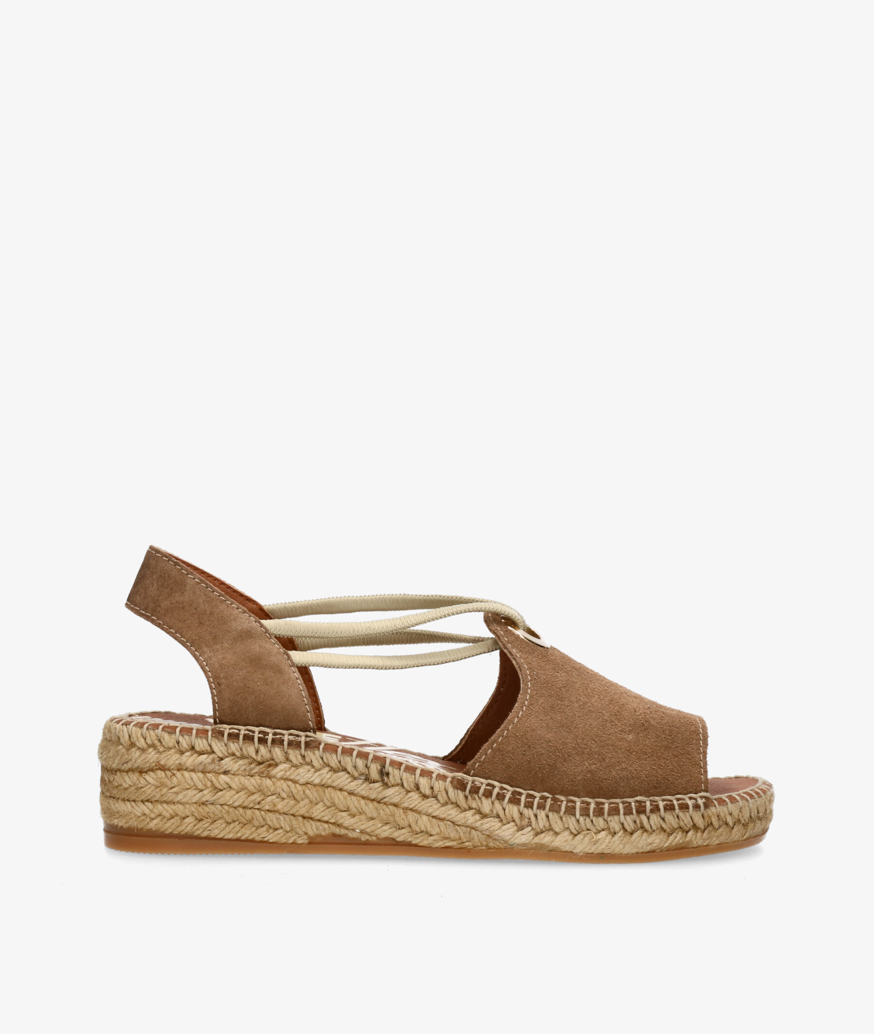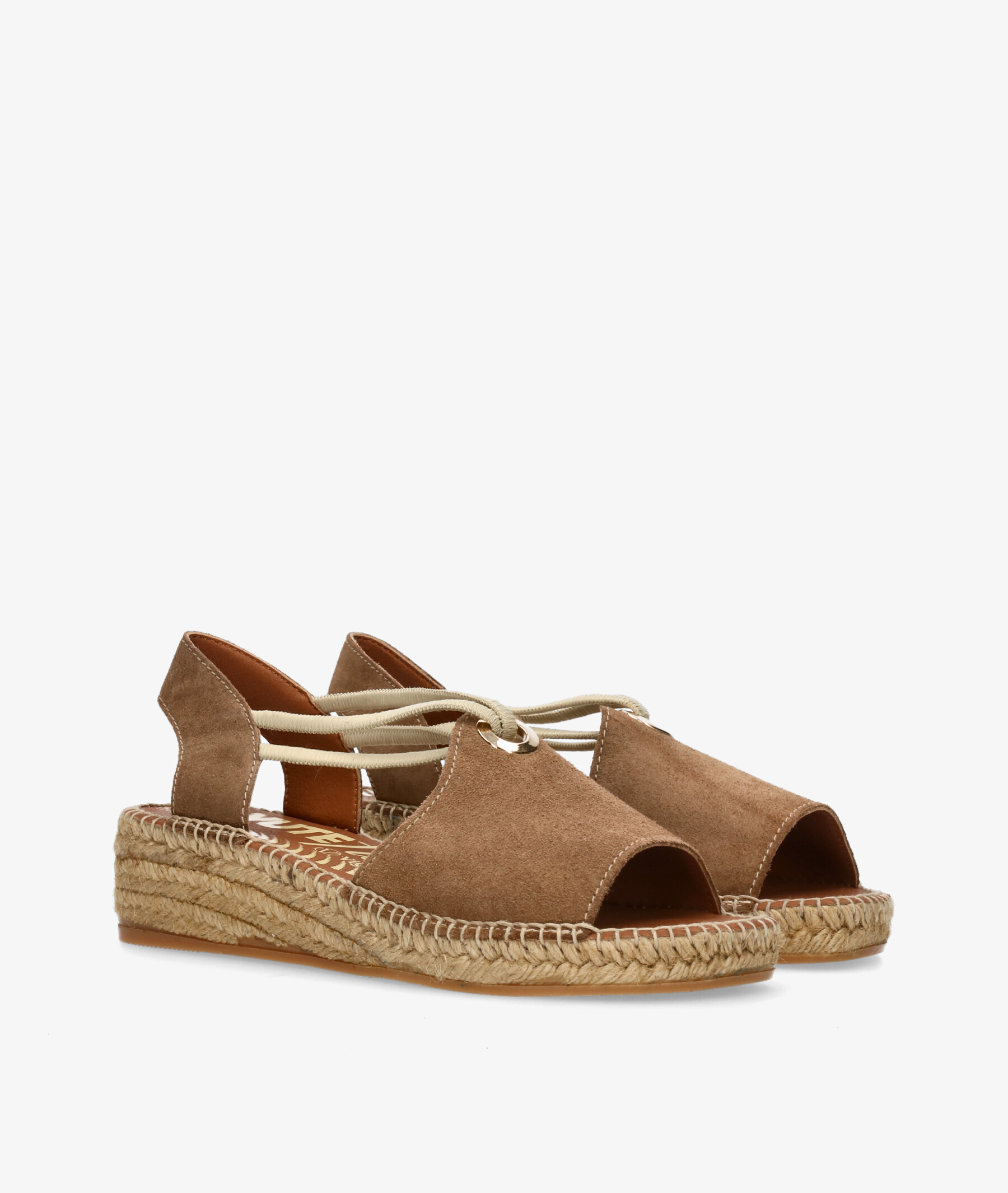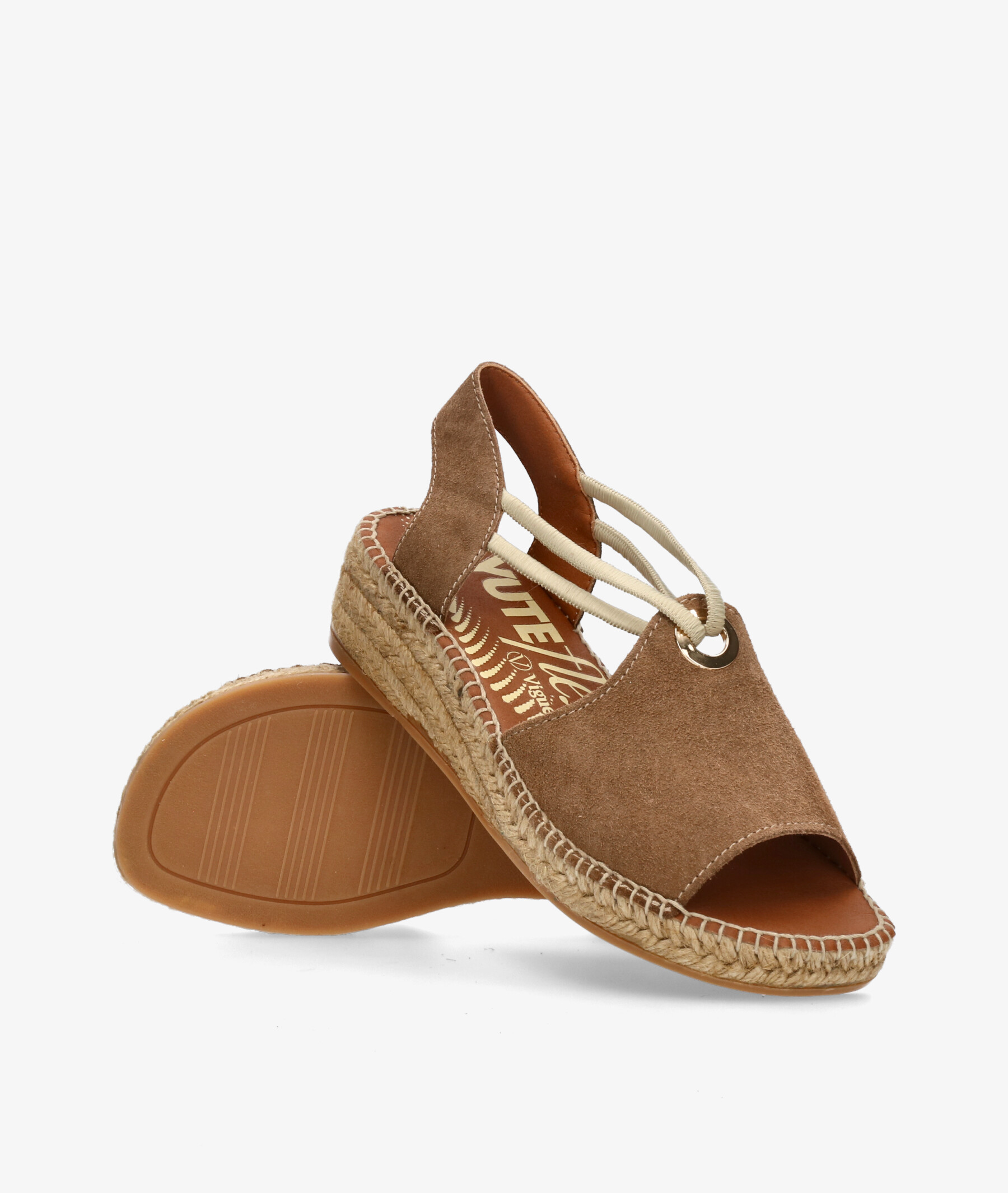 Alpargatas Viguera 2196 en serraje cuero. Tacón 4,5cm, plataforma 2cm. Cierre con elásticos . La plantilla no es extraible. Hecho en España.