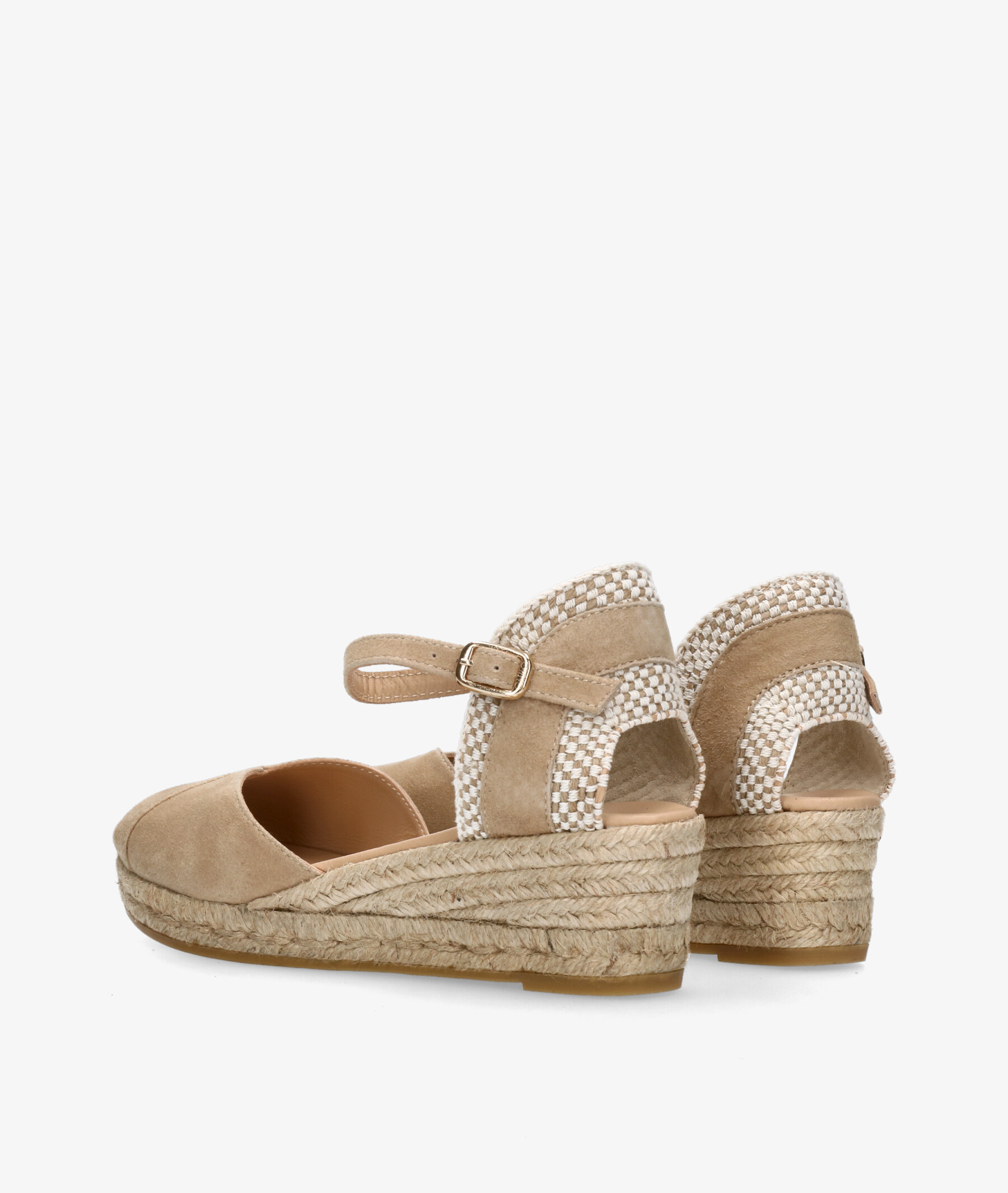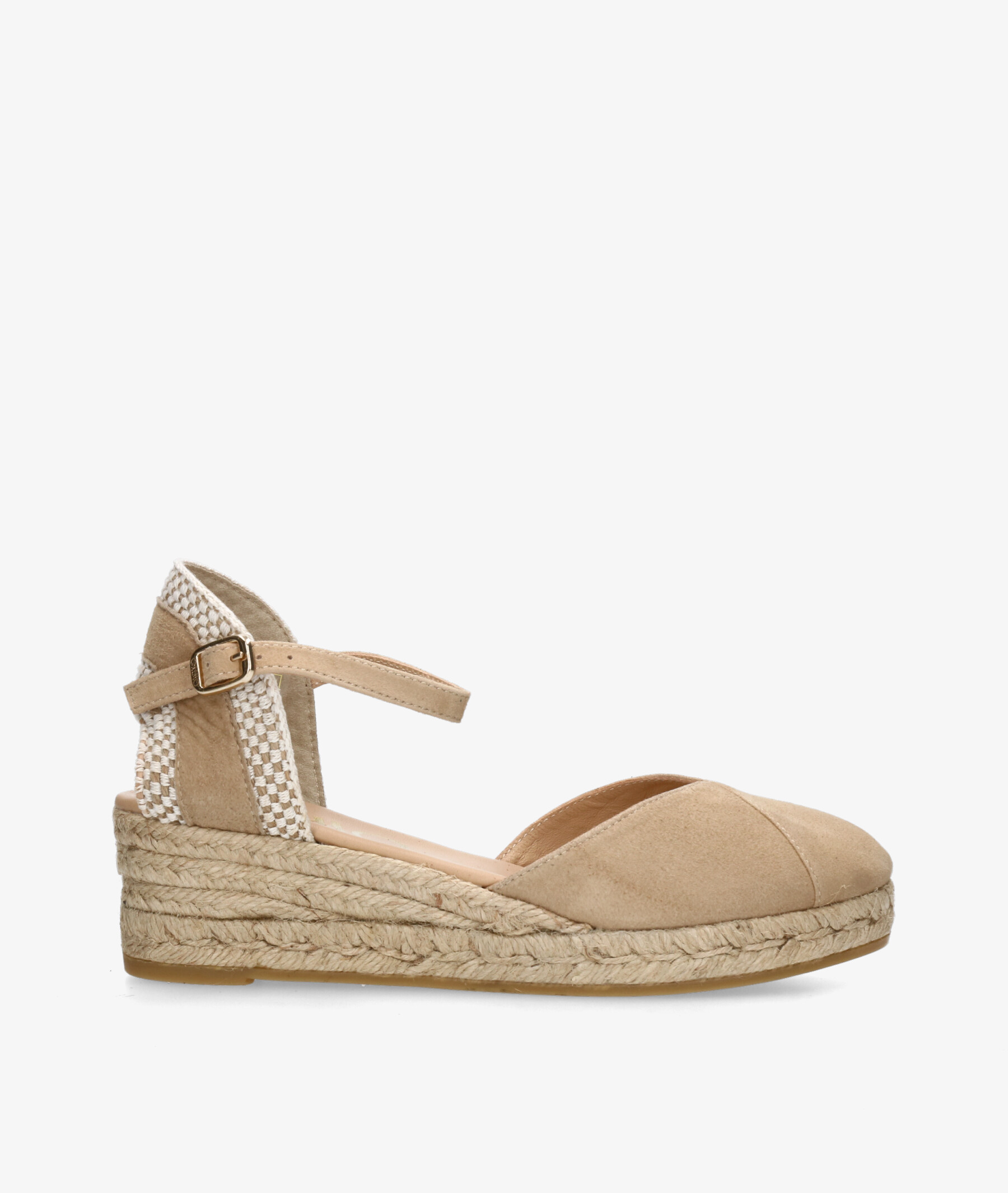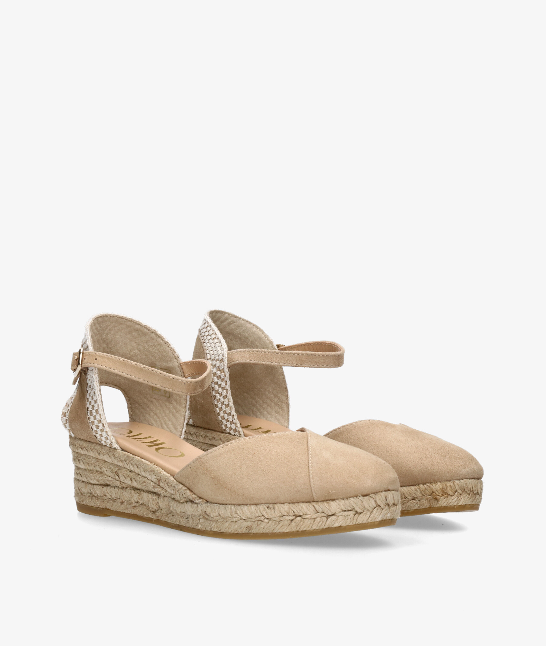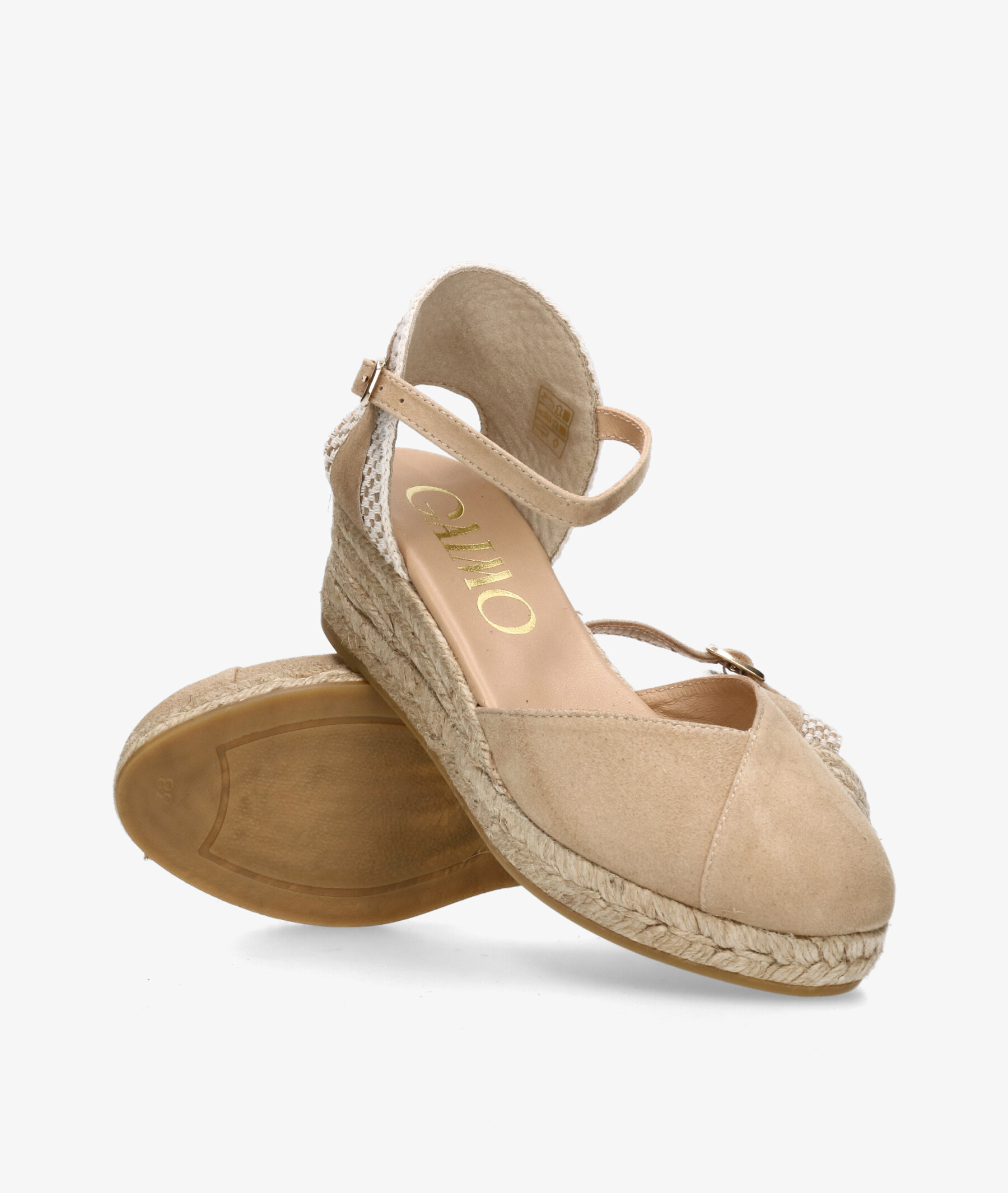 Alpargatas Gaimo COPITA en ante camel . Cuña 5cm, plataforma 1,5cm. Cierre con hebilla en un lateral. La plantilla no es extraible. Hecho en España.