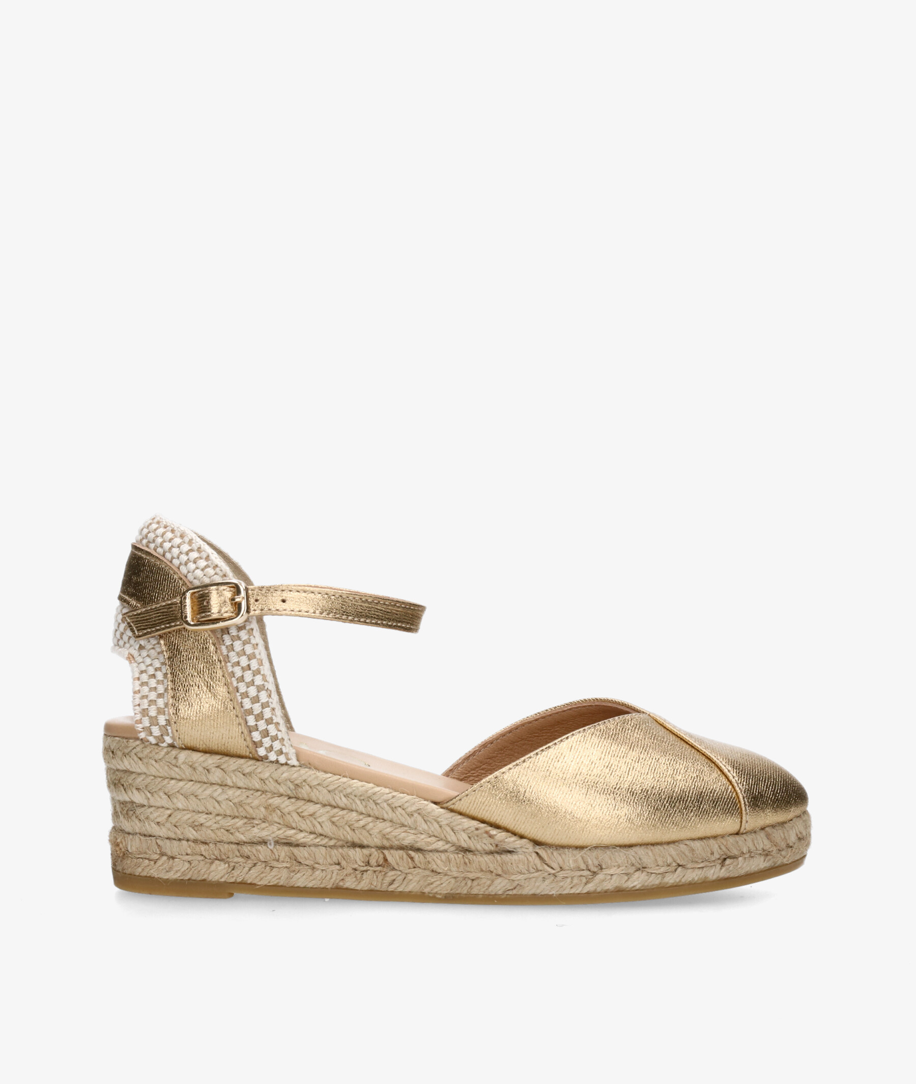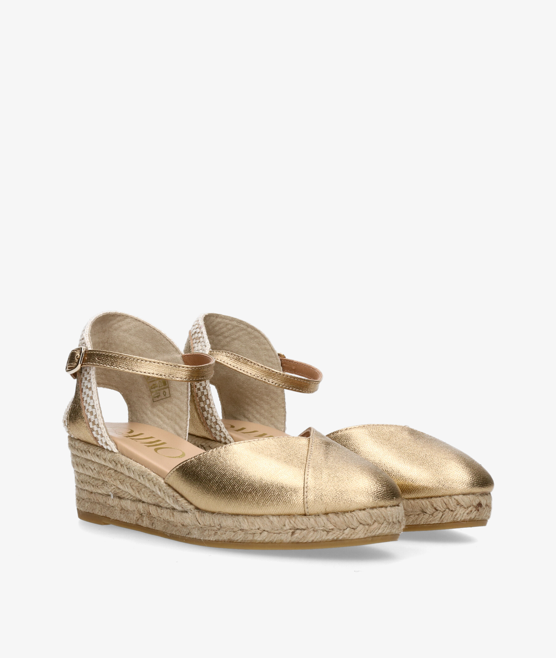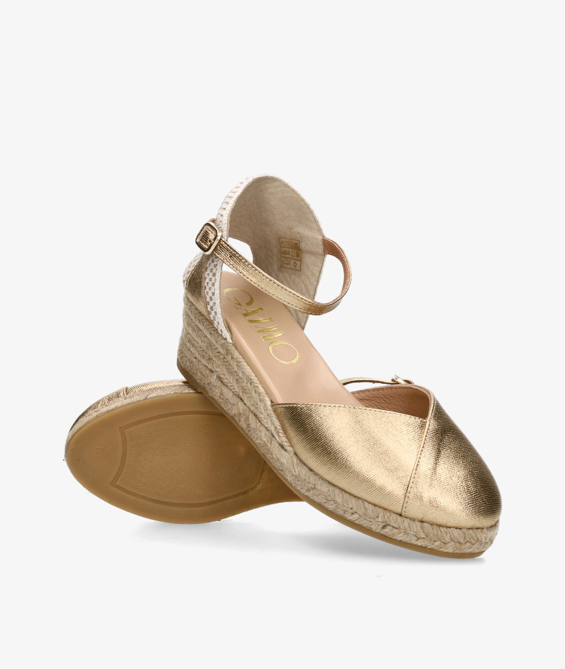 Alpargatas Gaimo COPITA en platino. Cuña 5cm, plataforma 1,5cm. Cierre con hebilla en un lateral. La plantilla no es extraible. Hecho en España.