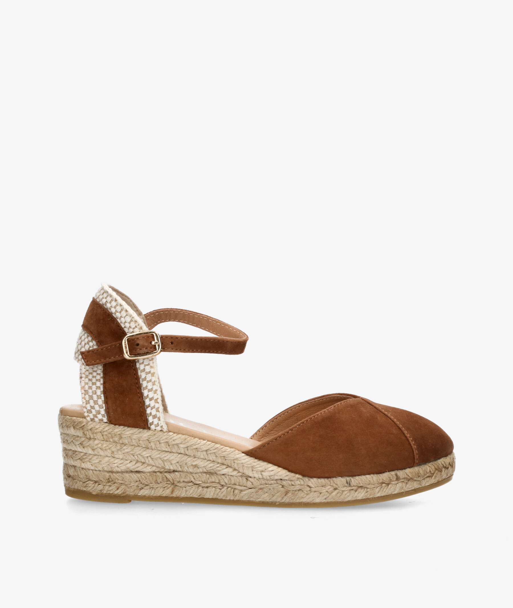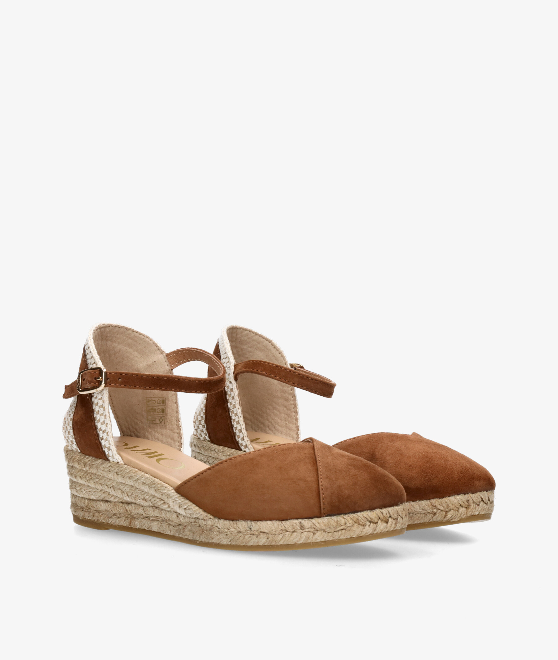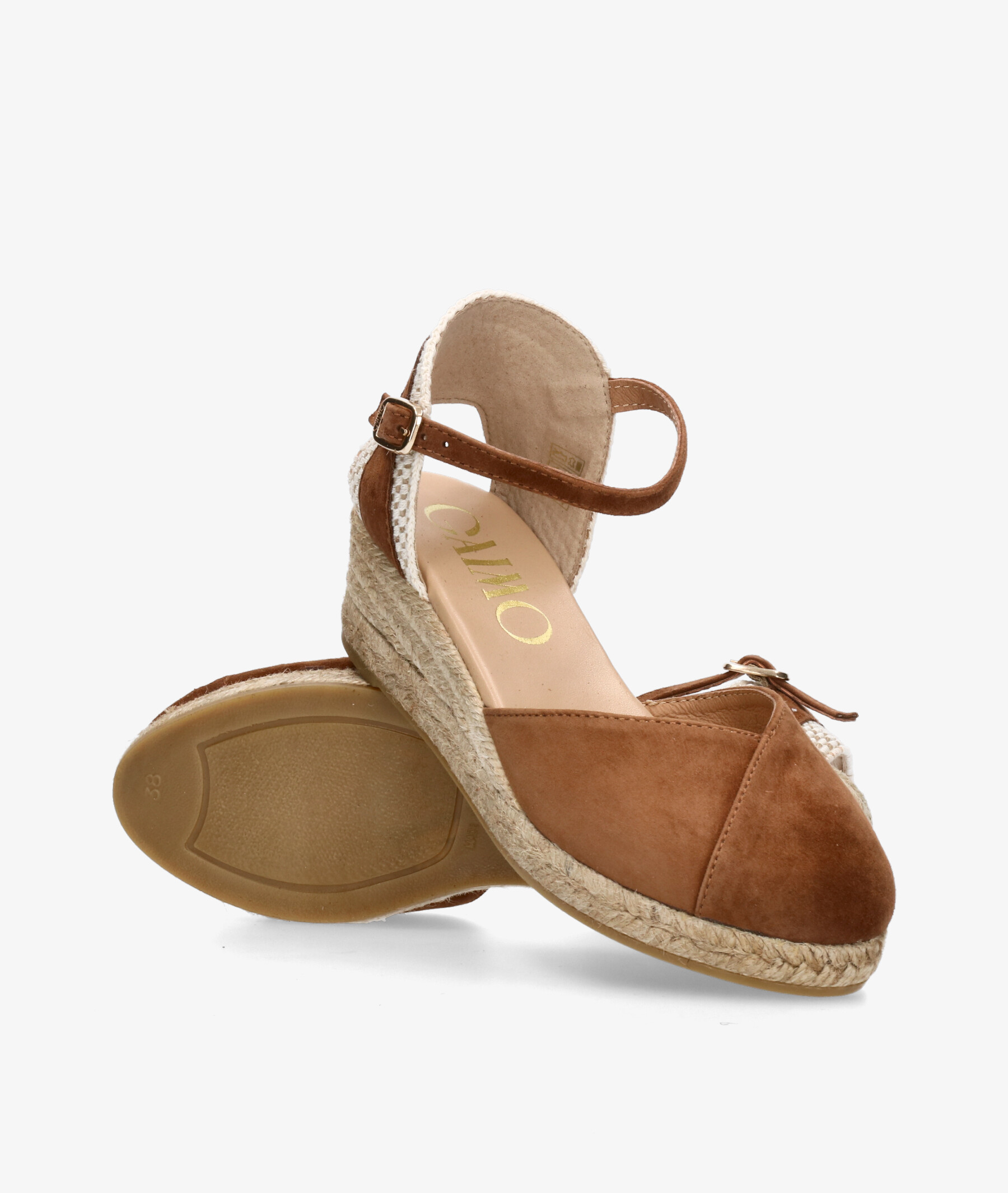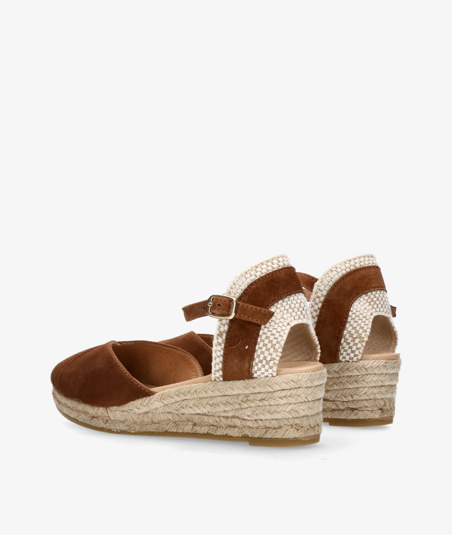 Alpargatas Gaimo COPITA en ante cuero. Cuña 5cm, plataforma 1,5cm. Cierre con hebilla en un lateral. La plantilla no es extraible. Hecho en España.