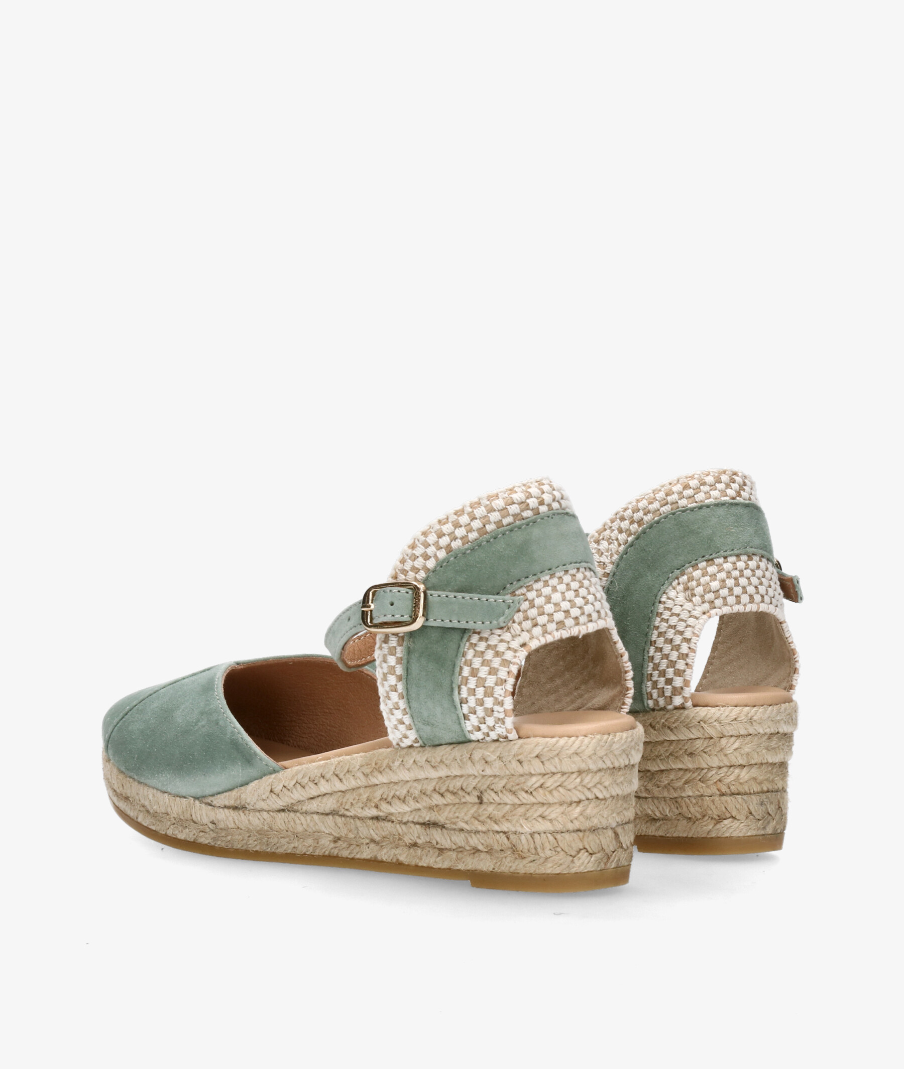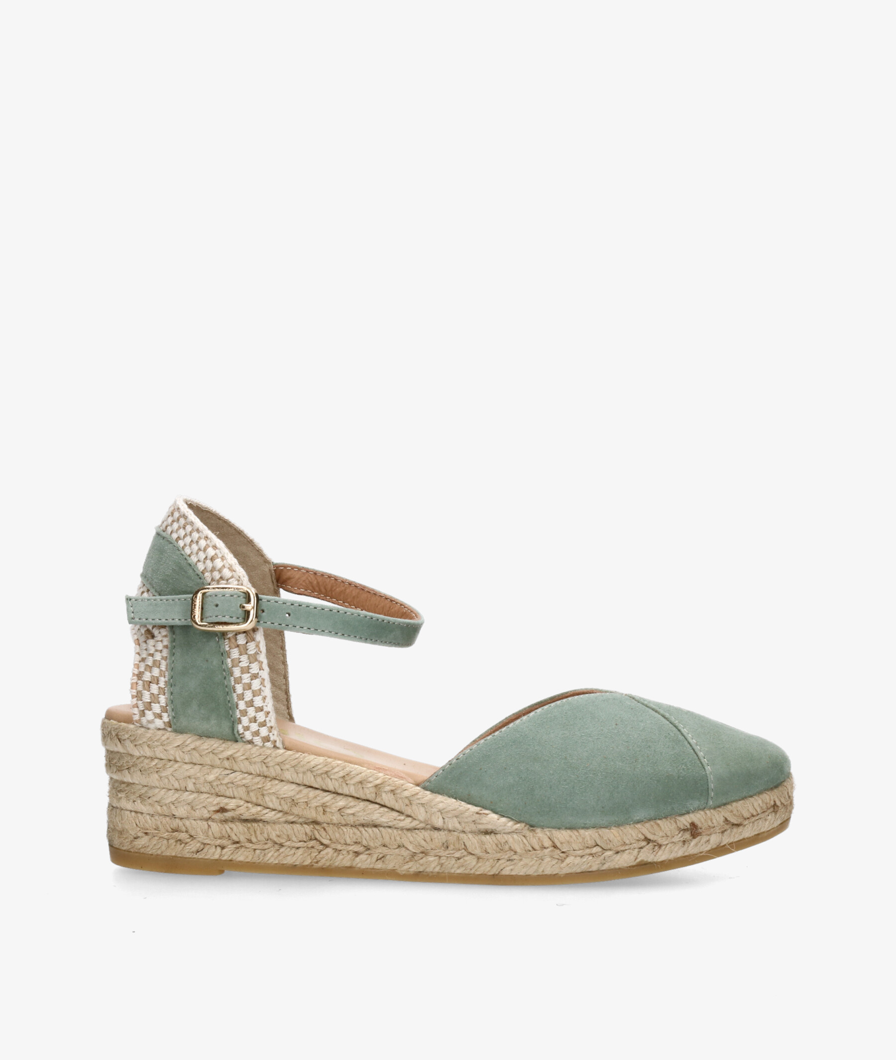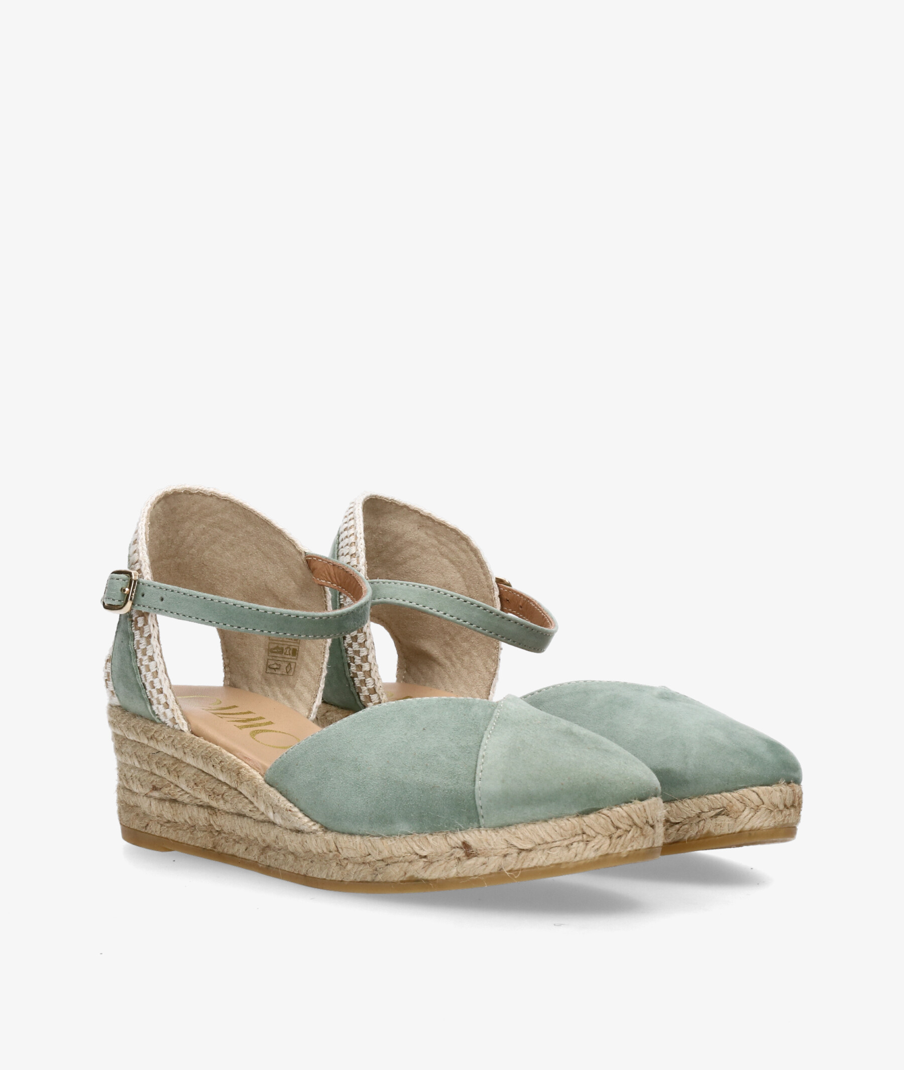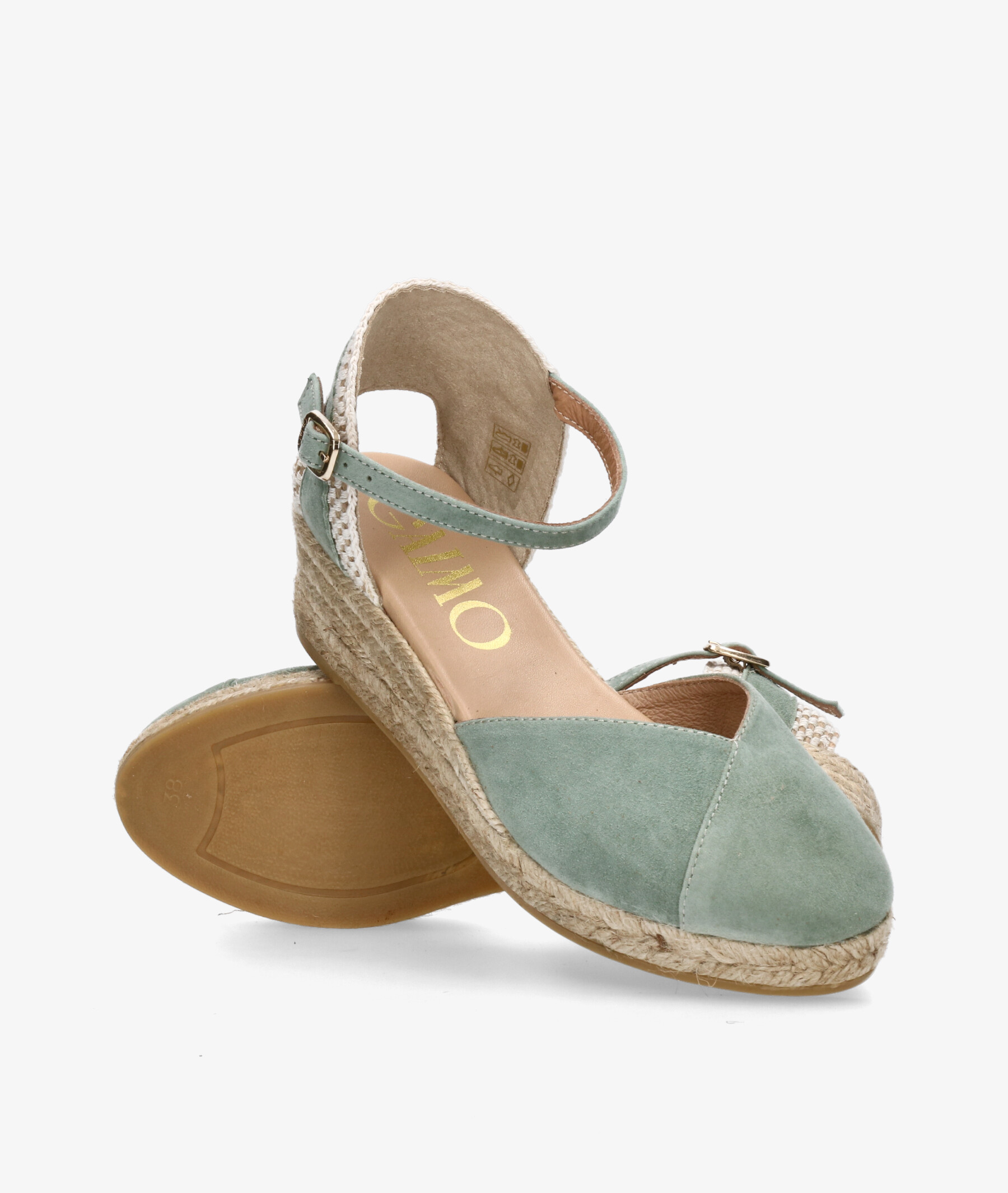 Alpargatas Gaimo COPITA en ante verde. Cuña 5cm, plataforma 1,5cm. Cierre con hebilla en un lateral. La plantilla no es extraible. Hecho en España.