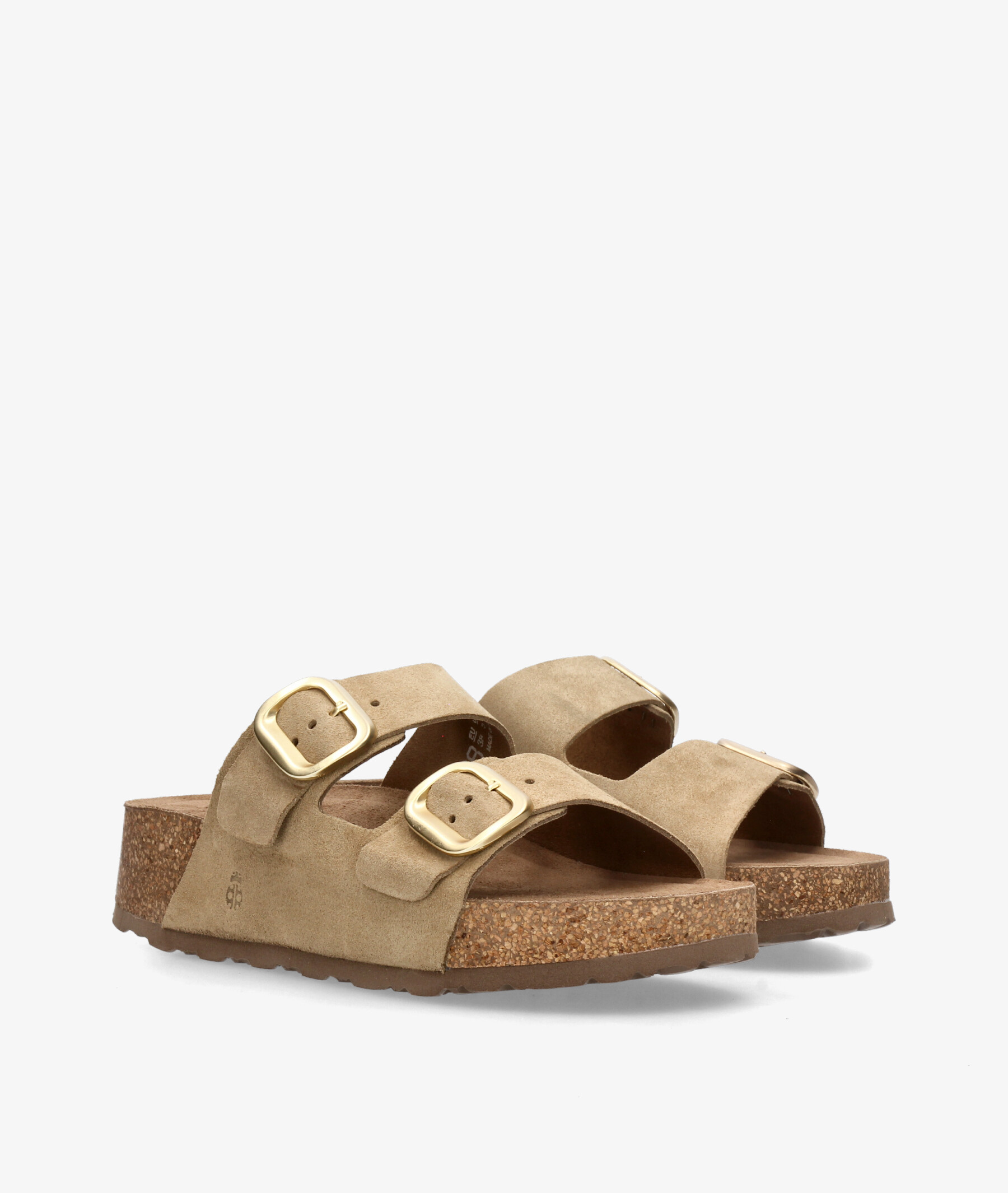 Sandalias Yokono WIWI 003 en serraje taupe. Cuña 4,5cm, plataforma 3cm. Sin cierre, slip on. La plantilla no es extraible. Hecho en España.