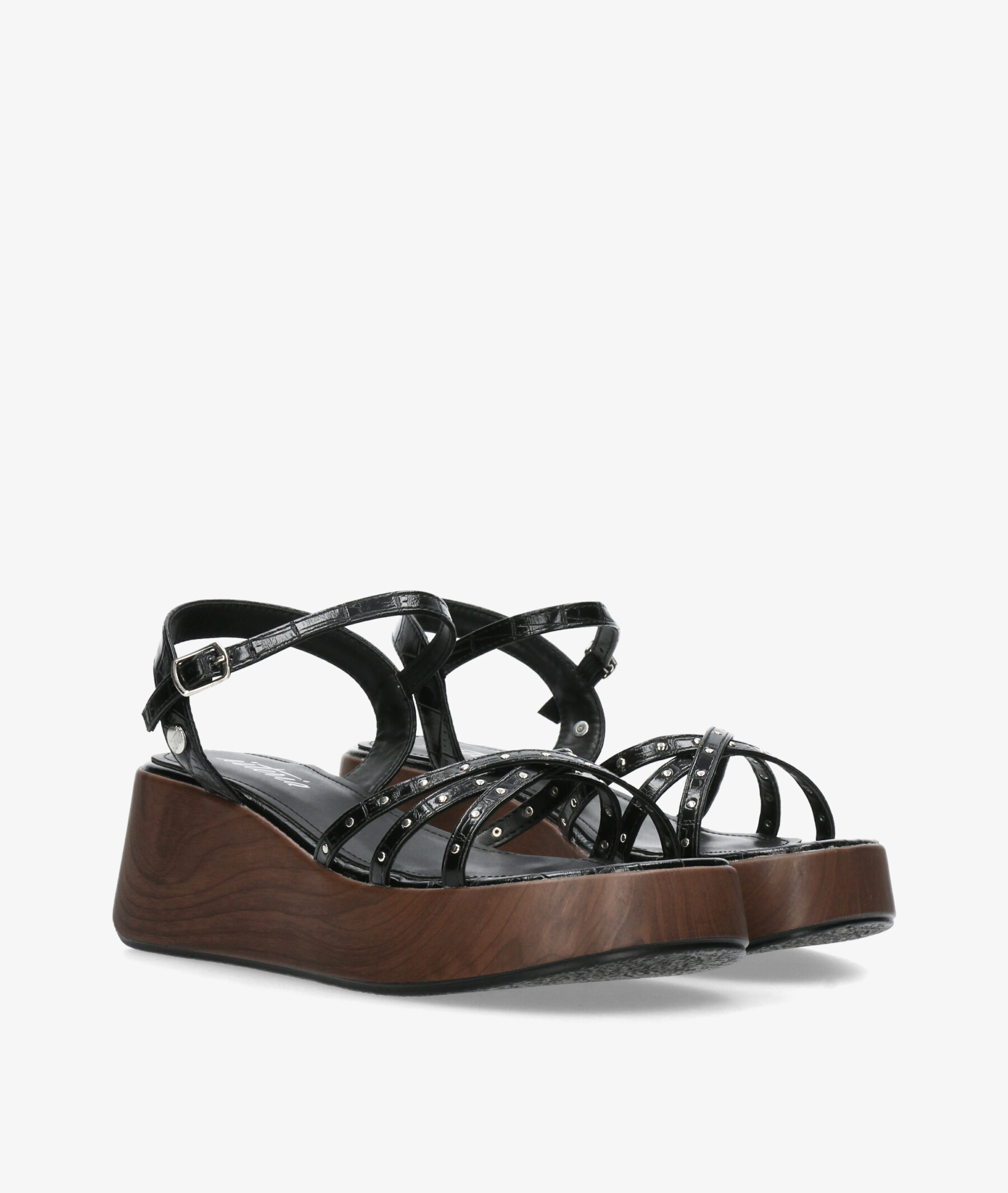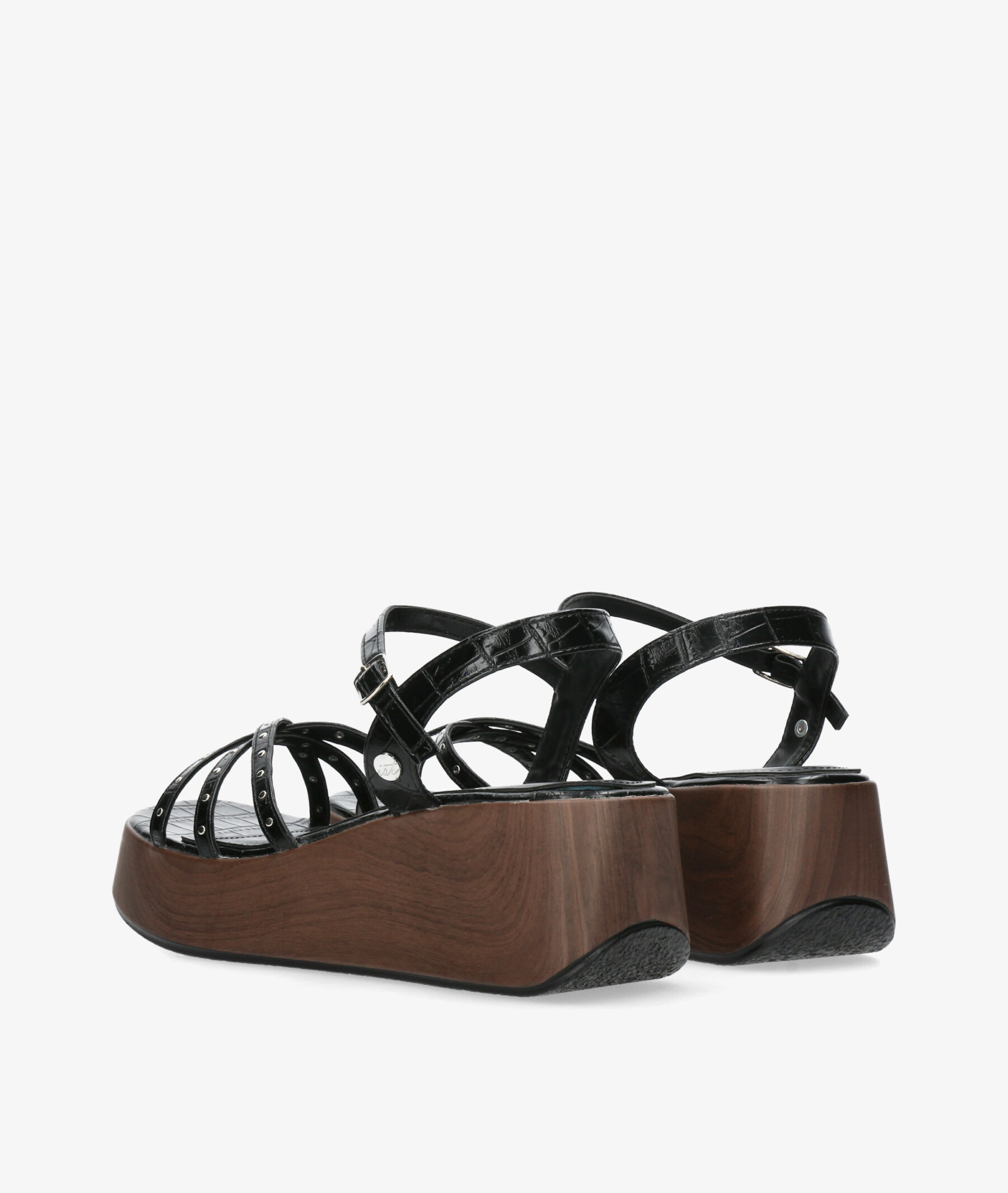 Sandalias ISTERIA 1111 en coco negro. Cuña 6cm, plataforma 3cm. Cierre con hebilla en un lateral. La plantilla no es extraible. Hecho en China