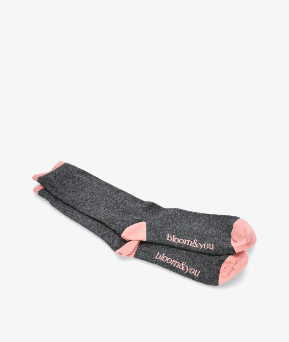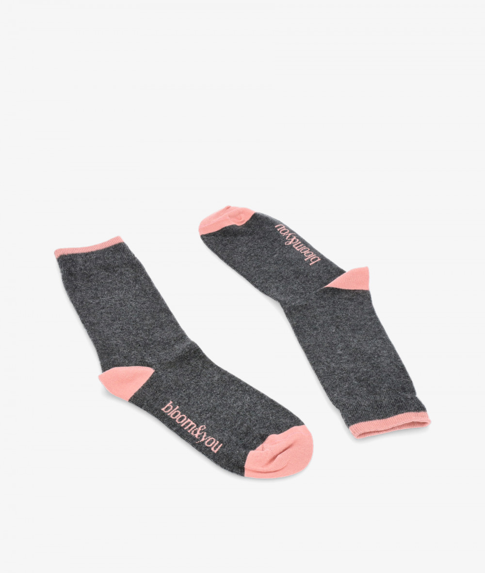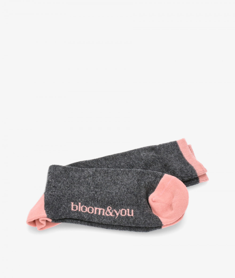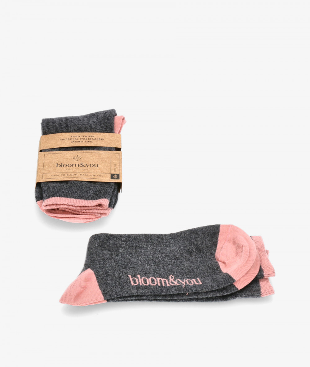 Calcetines bloom&you en negro. Calcetines combinados en gris oscuro con la puntera, trasera y logotipo en un rosa claro. . Nuestros Bloom socks están fabricados en algodón orgánico y son diseños exclusivos de Bloom&You . Algodón orgánico certificado por GOTS (Global Organic Textile Standard). 82% algodón orgánico, 15% poliamida y 3% elastano. Hecho en España. Talla única (36-40)