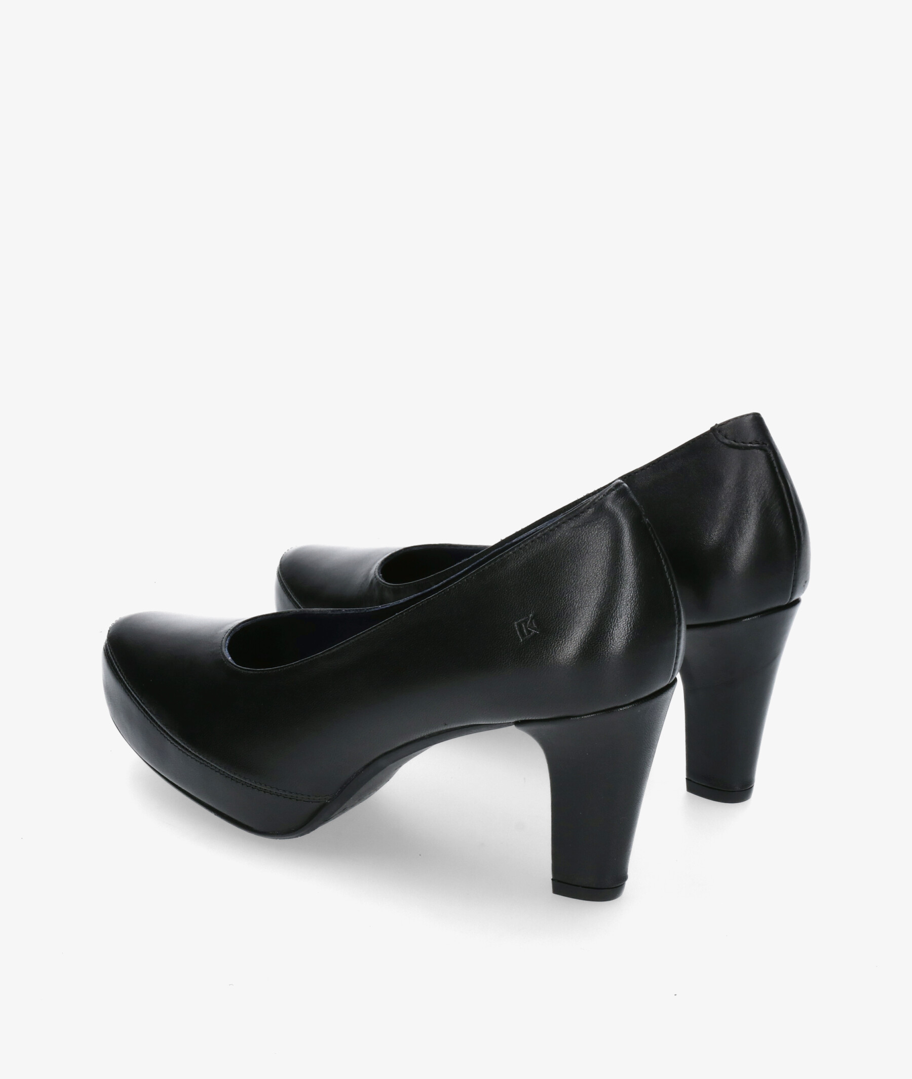 Zapatos Dorking 5794 en negro. Zapatos con tacón. Fabricados en piel, con forro interior textil y piso de goma. Tacón 7,5cm, plataforma 1,5cm. Sin cierre, slip on. La plantilla no es extraible. Hecho en España.